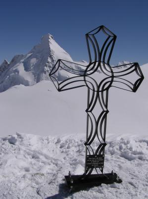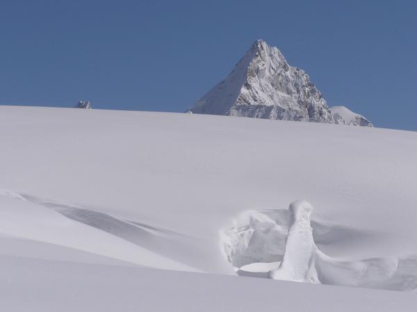Teil 2 der Osterschneeschuhtour: Um 07 00 Uhr starteten wir als einzige und erste Seilschaft von der Schönbielhütte aus. Zuerst rund 100 m Abstieg hinunter auf den Zmuttgletscher und über die Seitenmoräne dem Stockji entlang. In einem ersten Anstieg auf das Plateau des Tiefenmattgletschers auf 3000 m. Von hier ersteigt man die zweite Steilstufe und erreicht den Stockjigletscher - hier weit ausholend in nördliche Richtung gegen 3200 m, dann die Spaltenzonen umgehend bis auf etwa 3550 m aufsteigen. Nach einem kurzer Aufschwung erreicht mann den 3600 m hohen Col de la Tête Blanche. Über den sanft geneigten Bergrücken erreicht man den Gipfel der Tête Blanche.