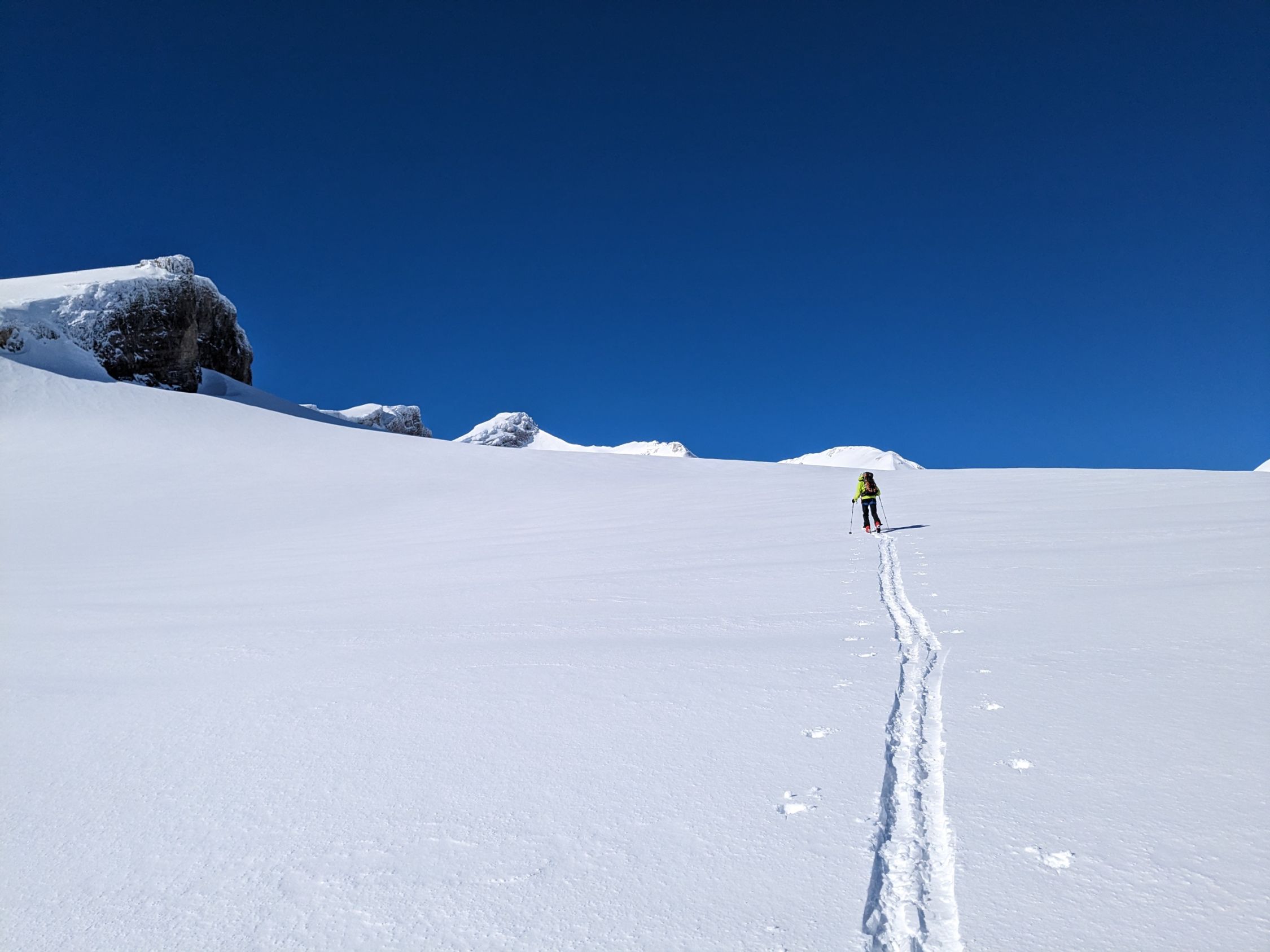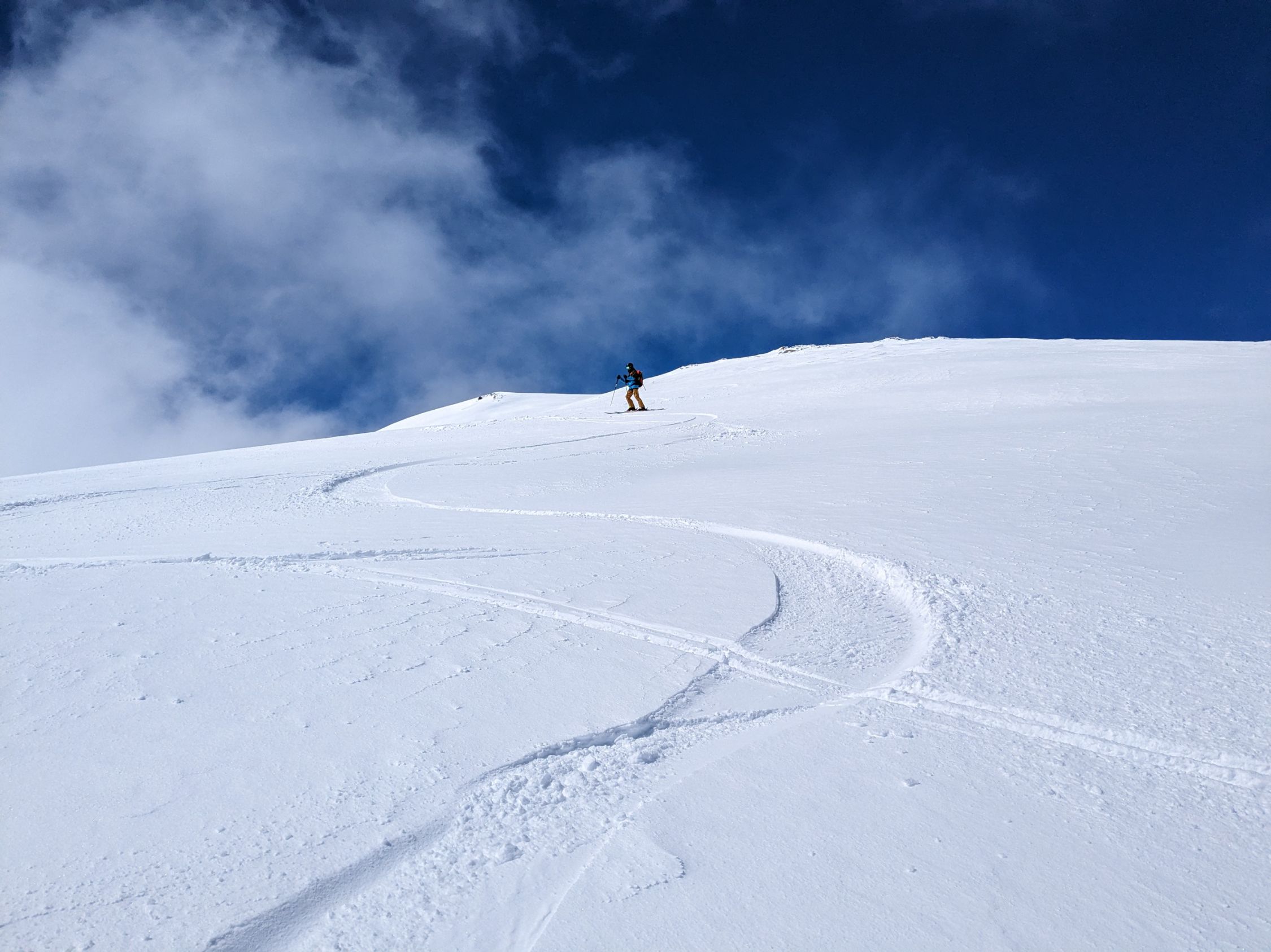 Ab der Wildhornhütte waren die Verhältnisse ausgezeichnet! Pulverschnee überall. Ein wenig dünn, wegen den Wind an vorherigen Tagen. Unten war die Hütte noch in Wolken, aber danach nur die blaue Himmel und Pulverschnee! Z.T. war es an steilen Traversen etwas wenig Neuschnee bzw. es wurde vom Wind weggetragen und das hat es etwas schwieriger gemacht. Sonst vom Gipfel bis zur Hütte perfekte Verhältnisse!
