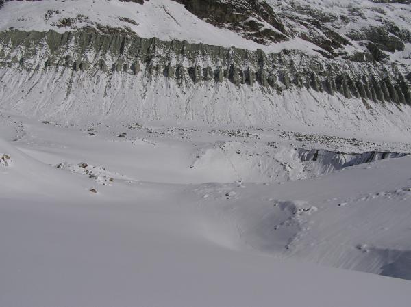 Abstieg von der Hütte über die Moräne. Der Schnee war hart gefroren und hatte bereits einen Harschdeckel. In gemütlichme Abstieg über den Zmuttgletscher erreichten wir bald einmal Stafel und Zermatt Furi