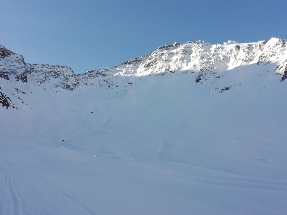 Morgens noch hart, Start 6.45. Schnee durchgehend ab Brücke über Ticino. Ohne Harscheisen, bis auf letzte 30 HM. Abfahrt 10.15 Uhr. Oben hart, dann ab 2200m angenehm zu fahren. Waldabfahrt zu. T. mit Abrutschen gut machbar.