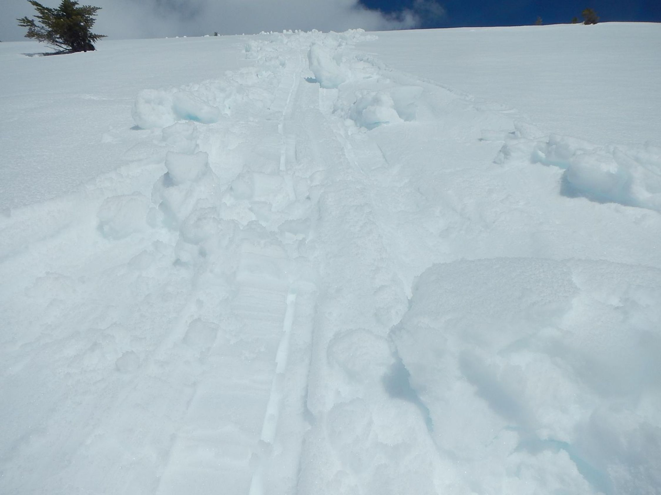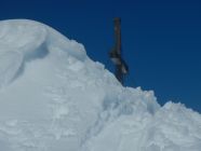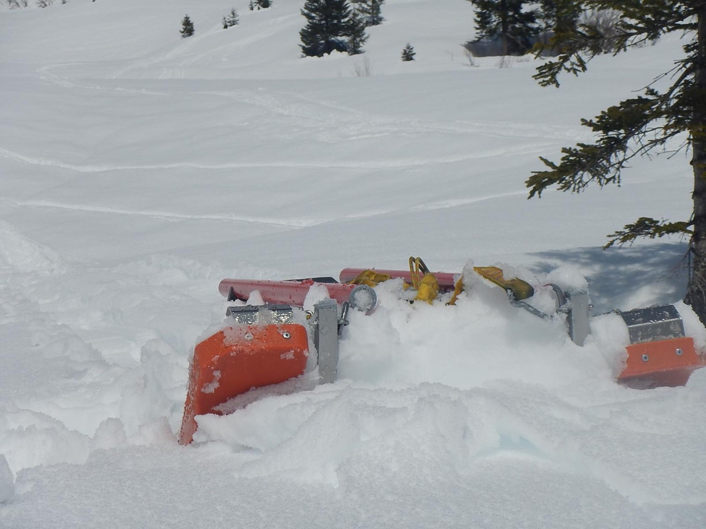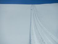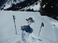 Durchfeuchtete Schneedecke, Einsinktiefe mit Schneeschuhen ca. 10 - 20cm, sonnig