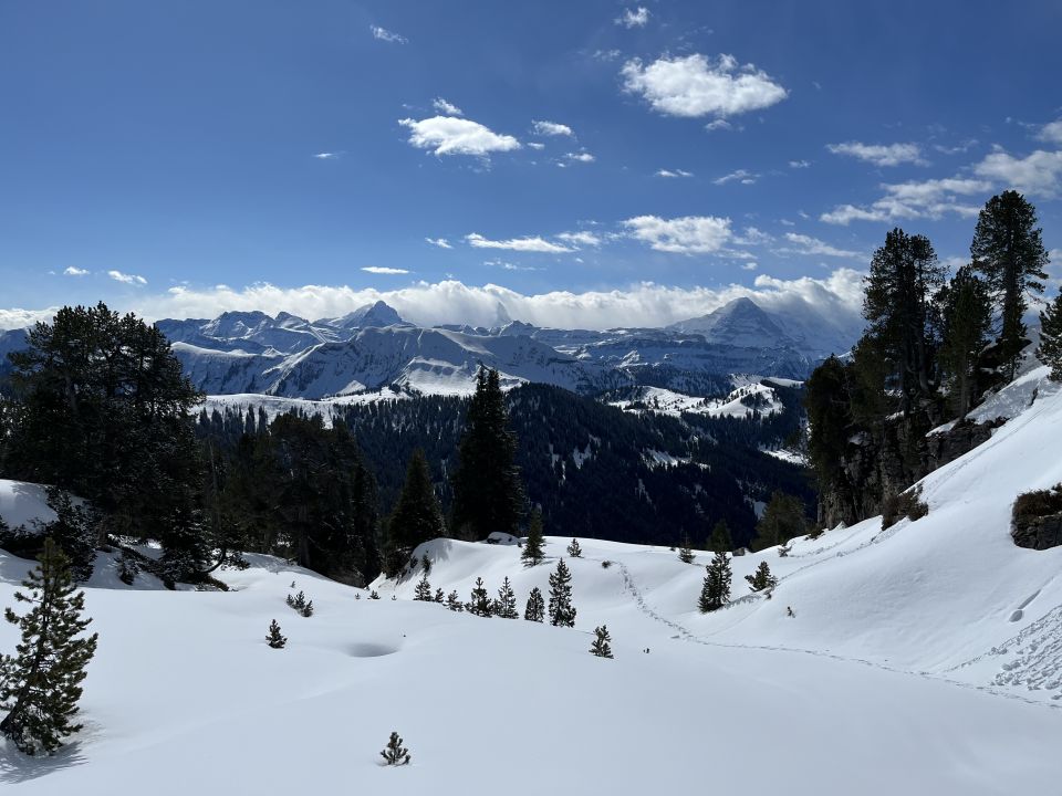 Quasi aper (und matschig) bis zum Grünenbergpass, darüber noch einzelne apere Stellen. Minim frischer Pulverschnee, der mit der Sonne rasch klebrig wurde. Obere Hänge (ab ca 1700 m) meist sulzig aber gut zu spuren (geringe Einsinktiefe bzw. dünne Schneedecke…)