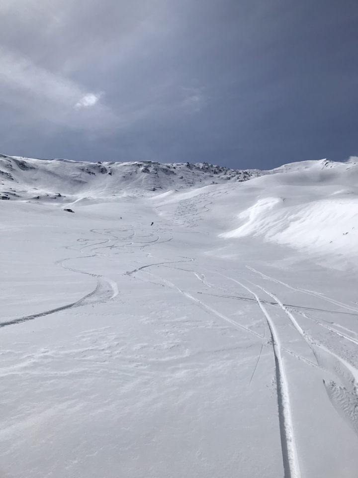 Insgesamt 8 Personen auf der Tour, davon ein sehr „Mutiger“, der Trotz des heutigen Bulletins direkt vom Gipfel in den steilen Nordhang einfuhr. Den Triebschnee sah man von weitem eigentlich sehr gut von der Aufstiegsroute her und auch die Windzeichen am Gipfelgrat waren unverkennbar.