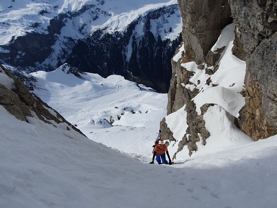 Nordhänge leicht gedeckelt, zuoberst noch (schwerer) Pulverschnee; Verhältnisse im Couloir gut