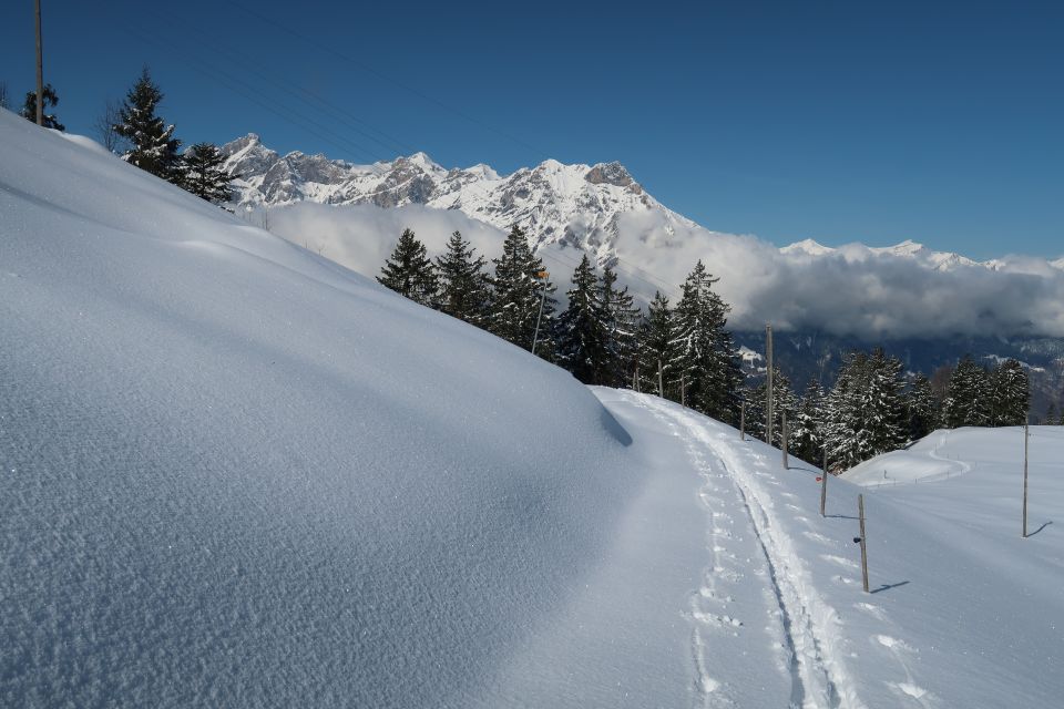 Die Skis konnten bei der Bergstation Eggenbergli angeschnallt werden. . Von der Bergstation durch den Oberschwändwald zum Steinboden alles noch unverspurt. Im Schächental hat es ordentlich Neuschnee gegeben in diesem Winter noch selten so viel.(Ca 50cm) Herrliche Sicht auf die Schächentaler Sonnenseite. Am Morgen ganze Route noch pulvrig um die Mittagszeit schon schwer und nass.