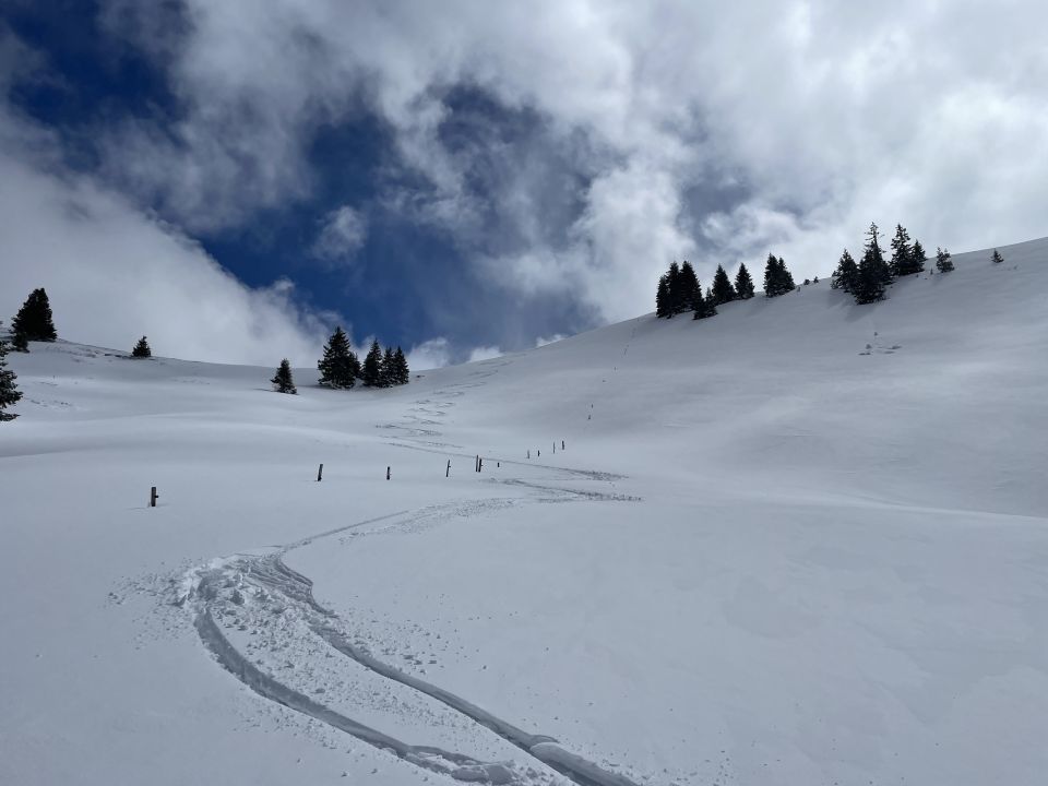 Nach zwei Wochen Auslandaufenthalt wollte ich schnellstmöglich wissen, wie es so um die Verhältnisse steht, auch wenn die Wettervorhersage nicht super war. Bei der Anfahrt ins Diemtigtal empfing mich Regen und dunkle Wolken. Also die etwas ambitionierten Ziele wieder mal auf nächstes Mal verschoben und bei Zwischenflüh rechts hoch. P beim Brätliplatz und kurz tragen, beim Abzweiger zum Stand anfellen. Wetter zunehmend aufgehellt und gar teils sonnig. Schnee von a bis z durchnässt, so stollte der Neuschnee wenigstens nicht. Abfahrt oben recht gut, schwingbarer Pappschnee, weiter unten dann eine Kleberei, die denen von der „letzten Generation“ vielleicht Freude gemacht hätte, mir weniger. Trotzdem nochmal angefellt und auf den Puur gestiegen. Inzwischen windig. Abfahrt vom Puur ebenso, oben gut, ab etwa 1750 MüM übergangslos voll klebrig. Ich zog es vor, die Ski vom Brüggli bis zum Brätliplatz zu tragen. Trotzdem happy, den Umständen entsprechend war das ein sehr schöner Tag heute, und wer hätte im Februar gedacht, dass man hier Ende April noch skitürlen kann? Eben.