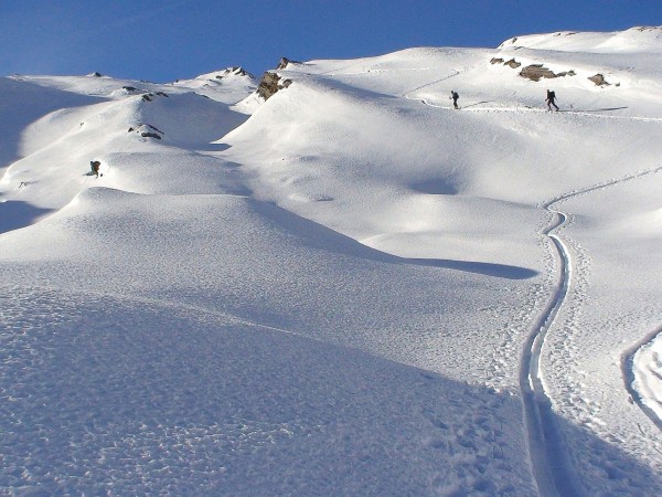 Der letzte Tag des Jahres 2006 darf ruhig etwas chaotisch zu Ende gehen. Mit einer abwechslungsreichen Skitour auf das Frunthorn, hoch über dem Zervreilasee, haben wir für heute wohl unsere Abenteuerlust gestillt. Wir fahren also mit der Gondel und zwei Schleppliften zur Dachberghütte hinauf und nehmen dort an der Bergstation, gleich eine verlockend ins Gelände gezogene Skispur auf. Die Falsche, wie sich bald herausstellte. Wir queren also in den Osthängen hinüber, Tälchen und Gräben überwindend, an die Südostecke des Dachbergs. Die anschliessende Traversierung der steilen Südosthänge, unter den Felsen des Dachbers, hat fast kein Schnee mehr, für unsere Felle. Schliesslich müssen wir zu Fuss weitergehen und können erst im Bereich des Fruntseeli wieder anfellen. In weiterer Folge geht es landschaftlich sehr schön, zwischen Felsblöcken hindurch, über Geländestufen und kleine Tälchen, zum Skidepot hinauf. Zu Fuss erreichen wir in etwa 20 Minuten den grossen Gipfelsteinmann. Für Windharschfreunde ist die Abfahrt jetzt ein Traum, für alle anderen ja wohl kaum. Ein paar Pulverschwünge sind dann auch noch drin, die sind natürlich ein Gewinn. Unbemerkt sind wir jetzt zu tief gefahren, wir denken uns...ja so ein Schmarren. Also wieder Felle auf die Ski und mit Vollgas zu den Pisten, so wie nie. Die letzte Gondel bringt uns dann ins Tal...begeistert sagen wir, die Tour war doch ne gute Wahl. HAPPY NEW YEAR wünscht euch allen...das Team Snowwolf.