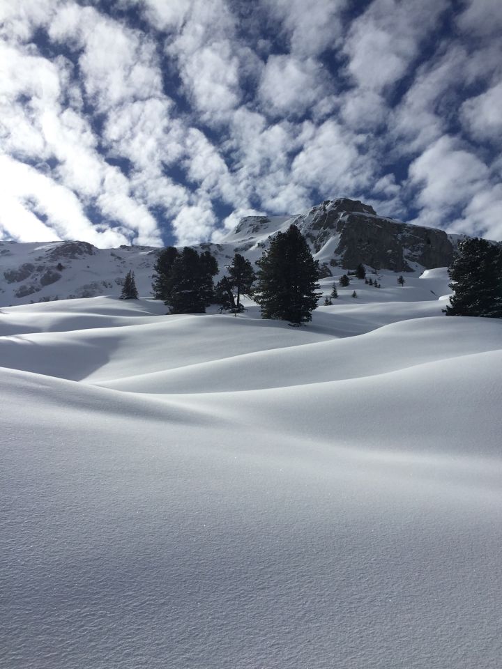 Auf dem Gipfel kalter Wind. Abfahrt vom schönsten Pulverschnee bis teils etwas windbearbeitetem Schnee alles vorgefunden. Abfahrt durch das coupierte Gelände sehr vergnüglich.