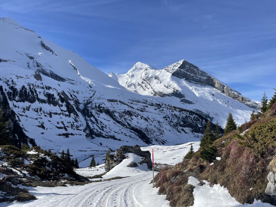 Schnee unten mau, mit Velo erst über Üschinenstrasse, anschliessend Trail bis P. 1483, dann getragen bis ca. 1670 (mit Steinski kann man in der Abfahrt noch 100 m weiter runter).