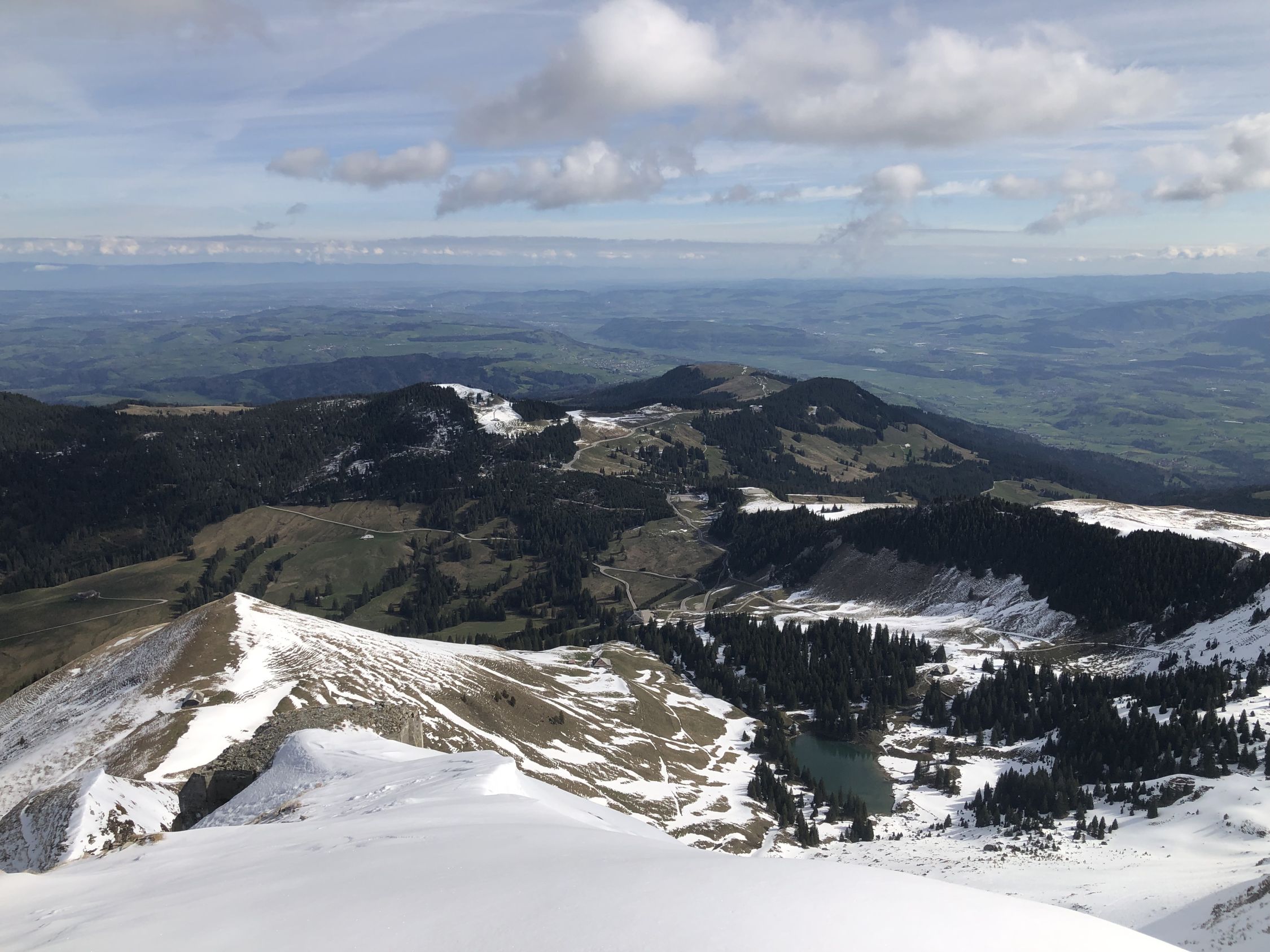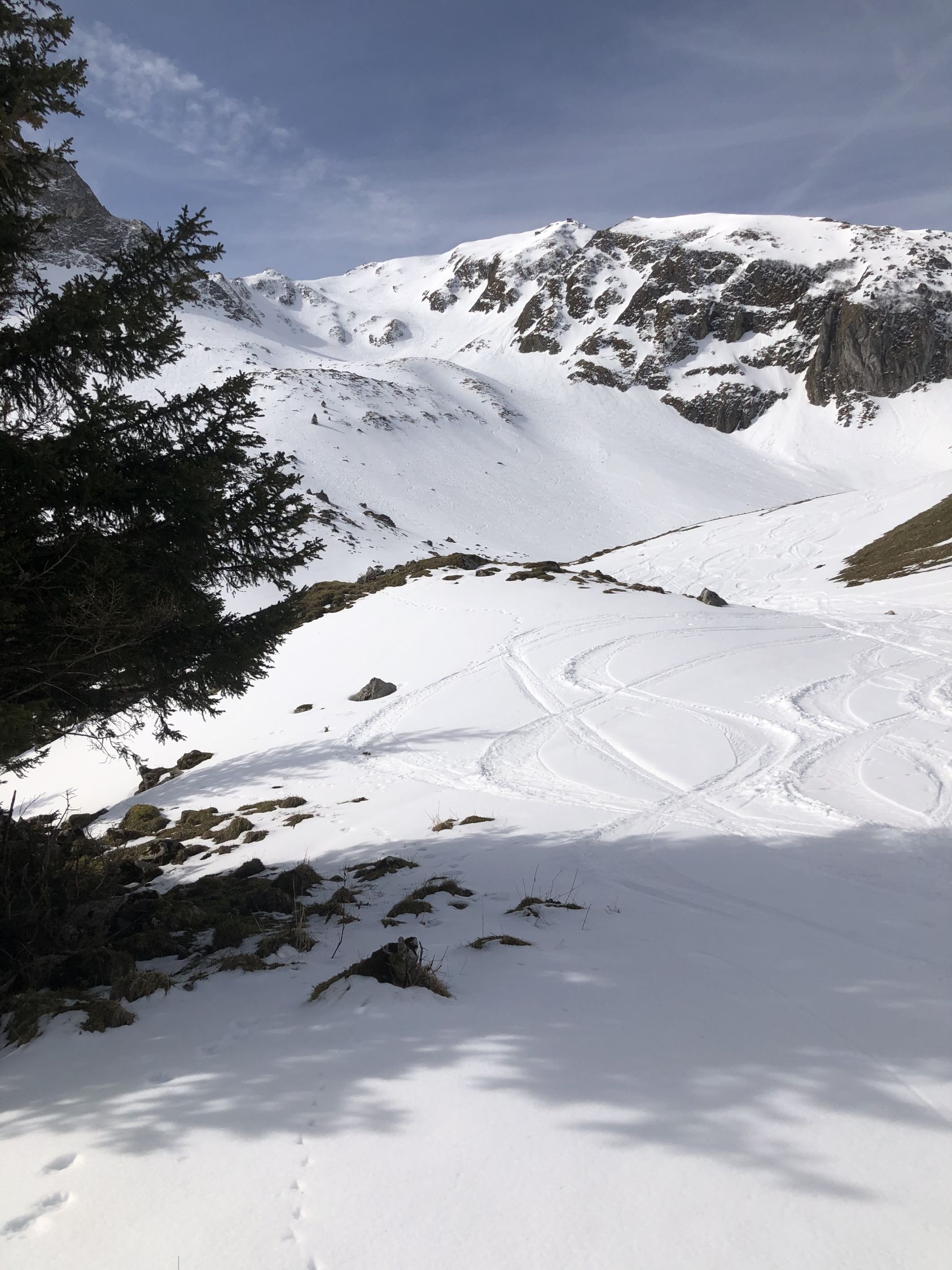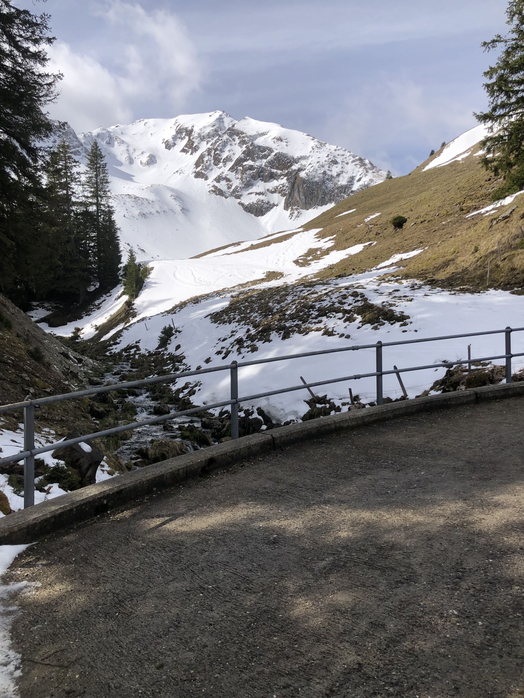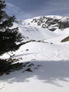 Schnee ab knapp oberhalb Brücke über Gantrischsense. Im Aufstieg gesetzter Schnee mit leichter Kruste bis ca. 1850, dann mehrheitlich ein Gemisch Presspulver bis Hartschnee, aber griffig bis Ausstieg. Harscheisen von Vorteil im oberen Bereich.