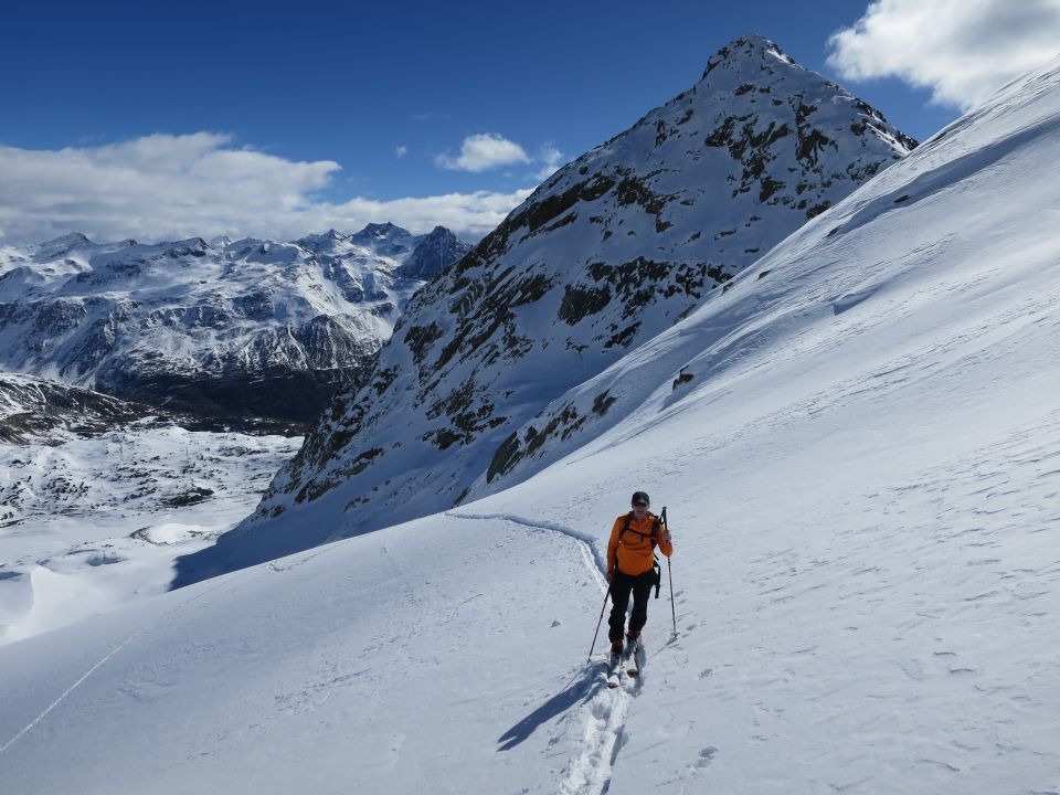 Ca. um 8 vom Lago Bianco aufgestiegen. Bis ca 2400m tragende Schneedecke, dann in den Mulden z.T. recht schwerer Pulver, so dass dann doch noch einige Spurarbeit nötig war. Das Wetter wurde immer bessser, so dass wir dann ca. um 10.30 bei schönster, warmer Sonne auf dem Wintergipfel (2988m) standen. Die Abfahr dann im oberen Teil noch sehr schön pulvrig, weiter unten dann zunehmend gedeckelt, aber auch etwas Sulz. Eine tolle Tour und wir waren doch erstaunt, dass wir alleine unterwegs waren.
