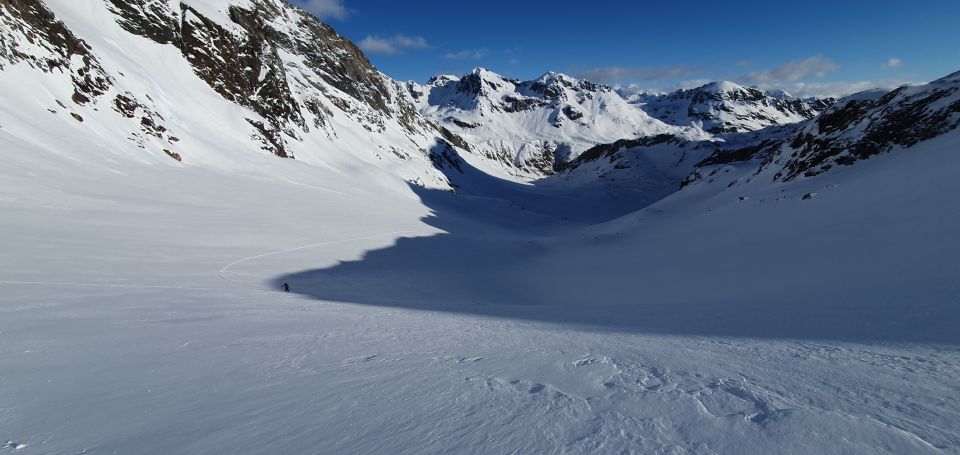 Abahrt um 11.00 vom Gipfel. Gipfelhang etwas gedeckelt aber gut zum fahren. Südhänge beginnend zu Sulzen, Nordseitig noch Pulverschnee.