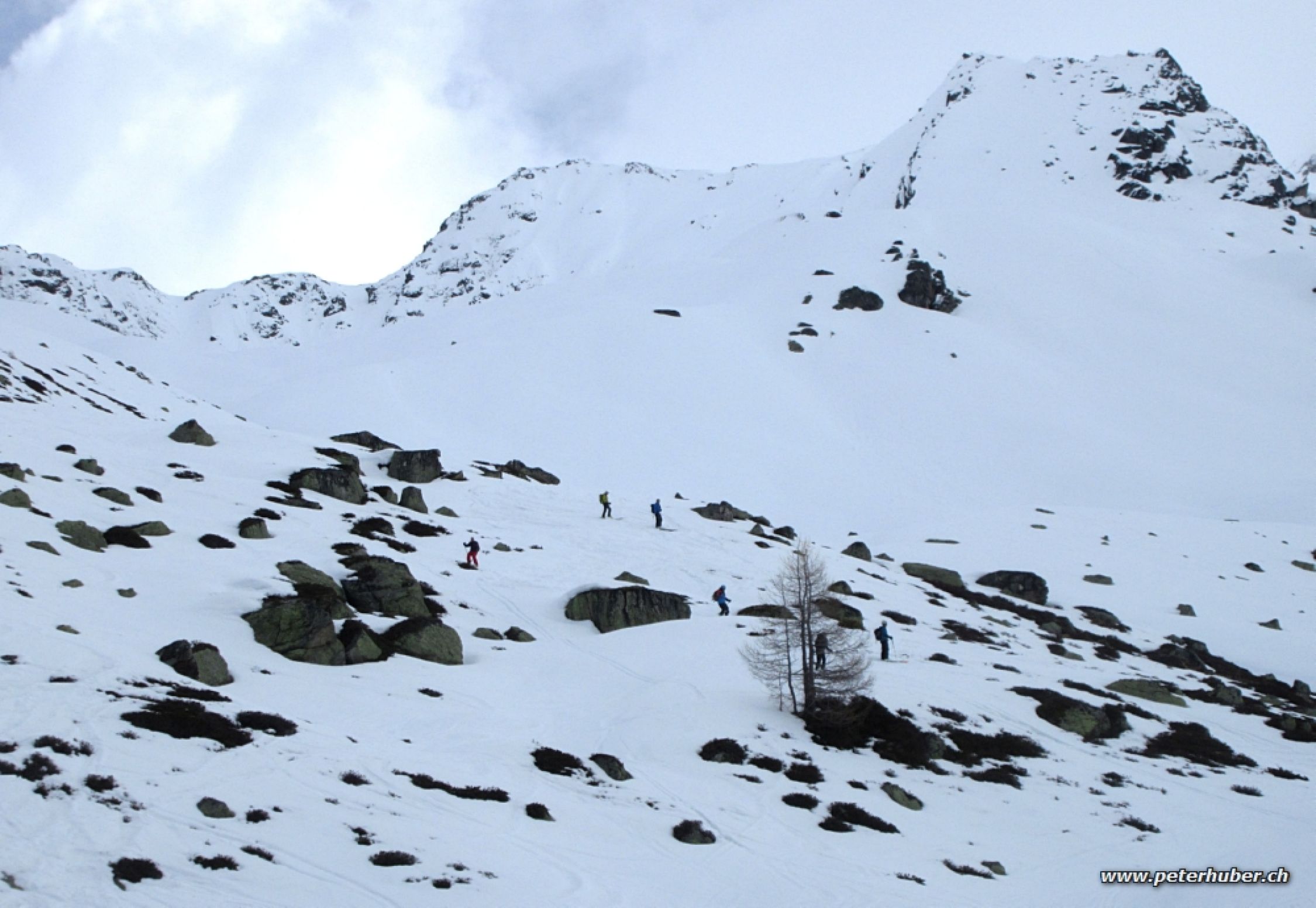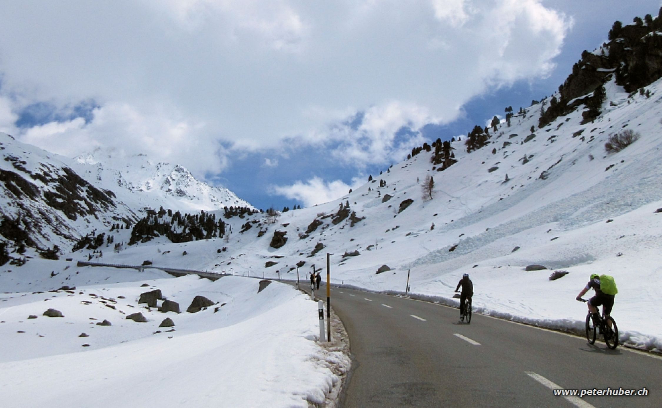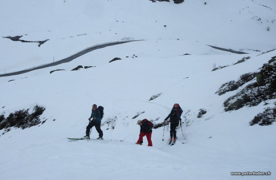 Da die Passstrasse erst heute Abend um 16 Uhr geöffnet wird, mussten wir die Skis auf aperer Strasse bis Rossboden ca. 45 Min tragen. Der Schnee am Strassenrand war sehr klebrig - haben wir gemieden.