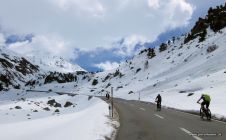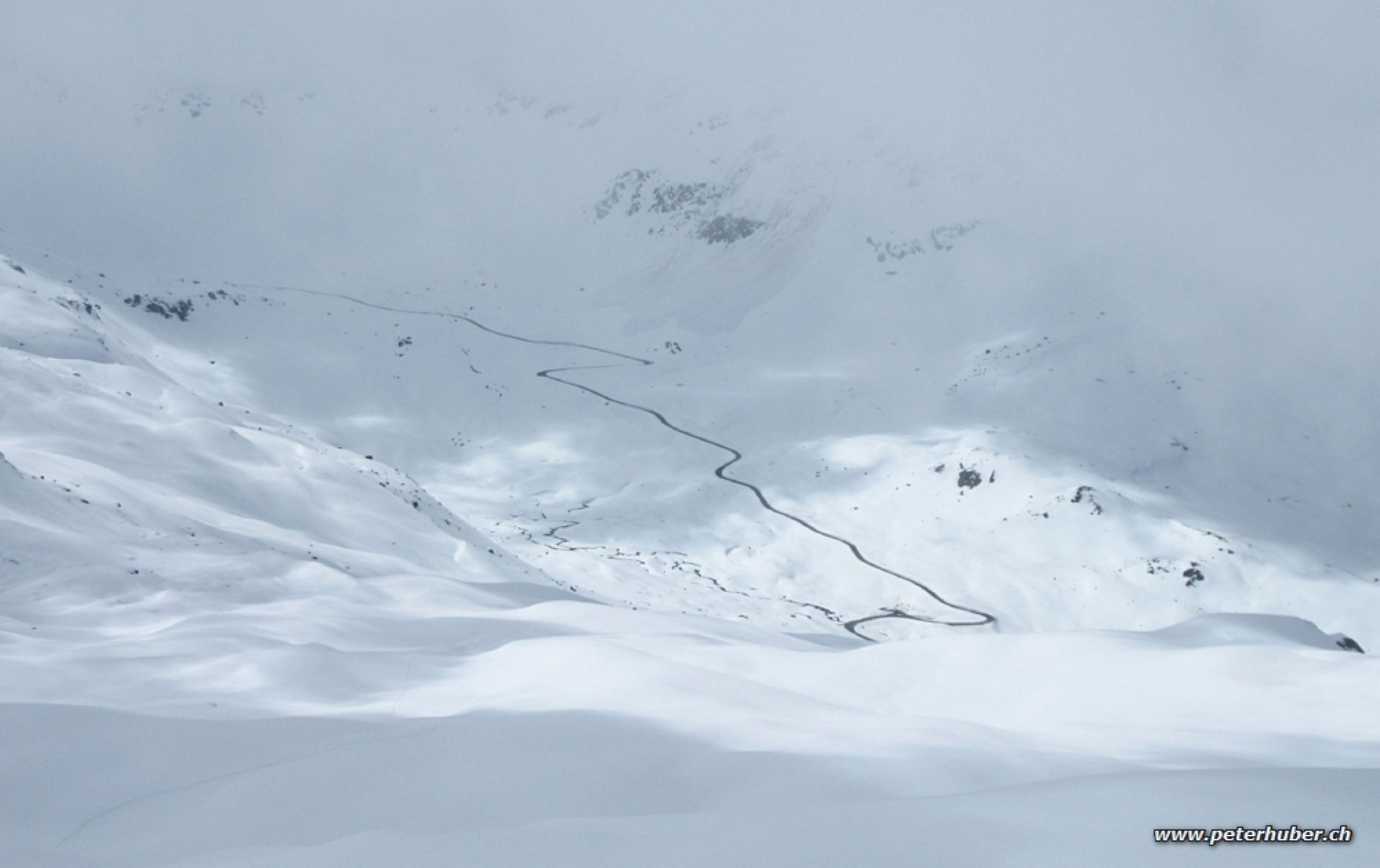 Abfahrt: Bis auf 2400 m hinunter sehr schöner feuchter Neuschnee, sehr gut zu fahren. Dann bis zur Passstrasse bei 2200 m hinunter "Wasserskifahren". Stellenweise ca. 20 cm eingesunken - einfach laufen lassen und runter kommen. Dann kurz auf dem Strassenbord abgefahren. Und dann ca. 30 Min Skitragen auf der aperen, nun trockenen Strasse.