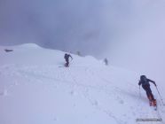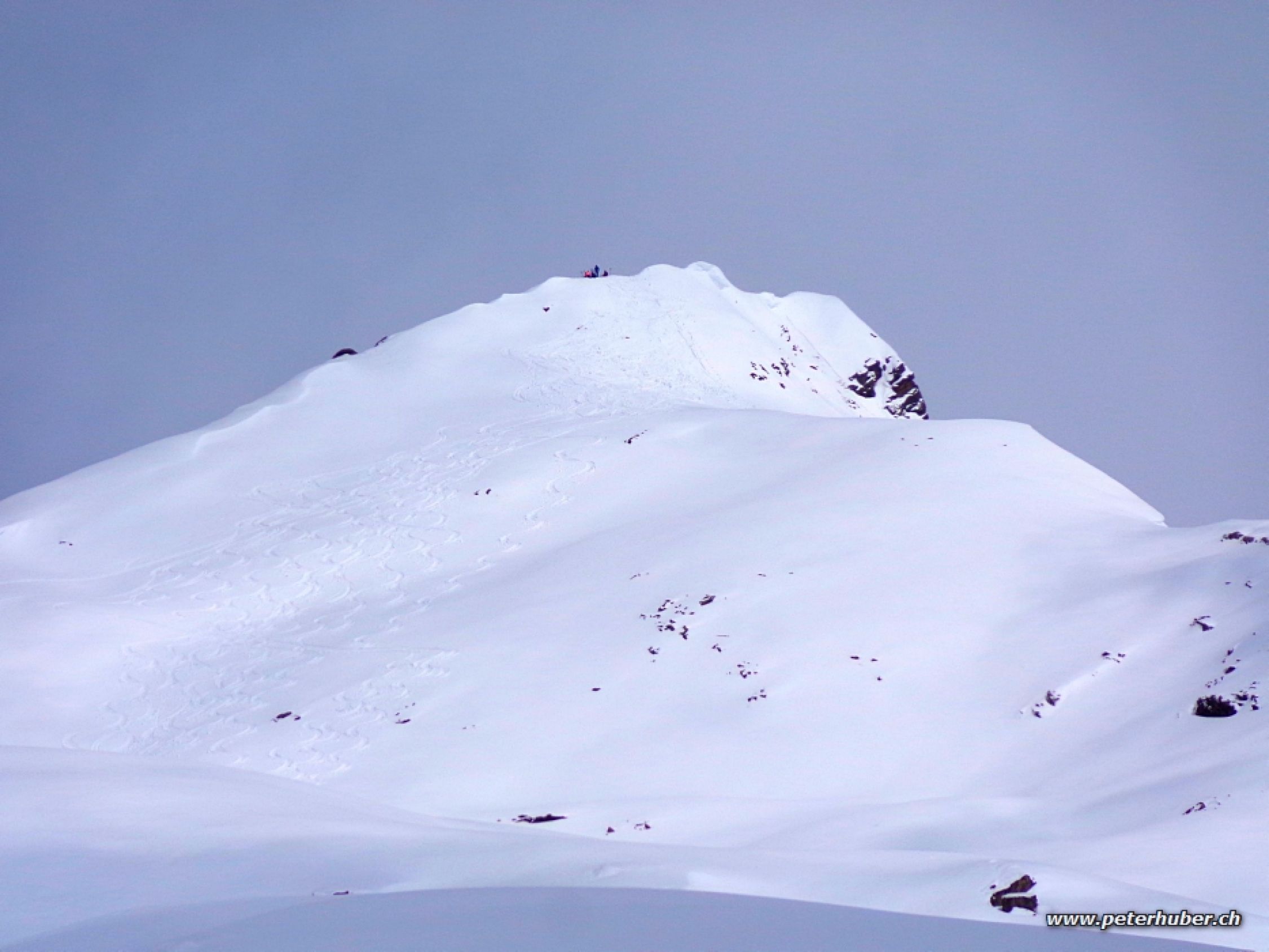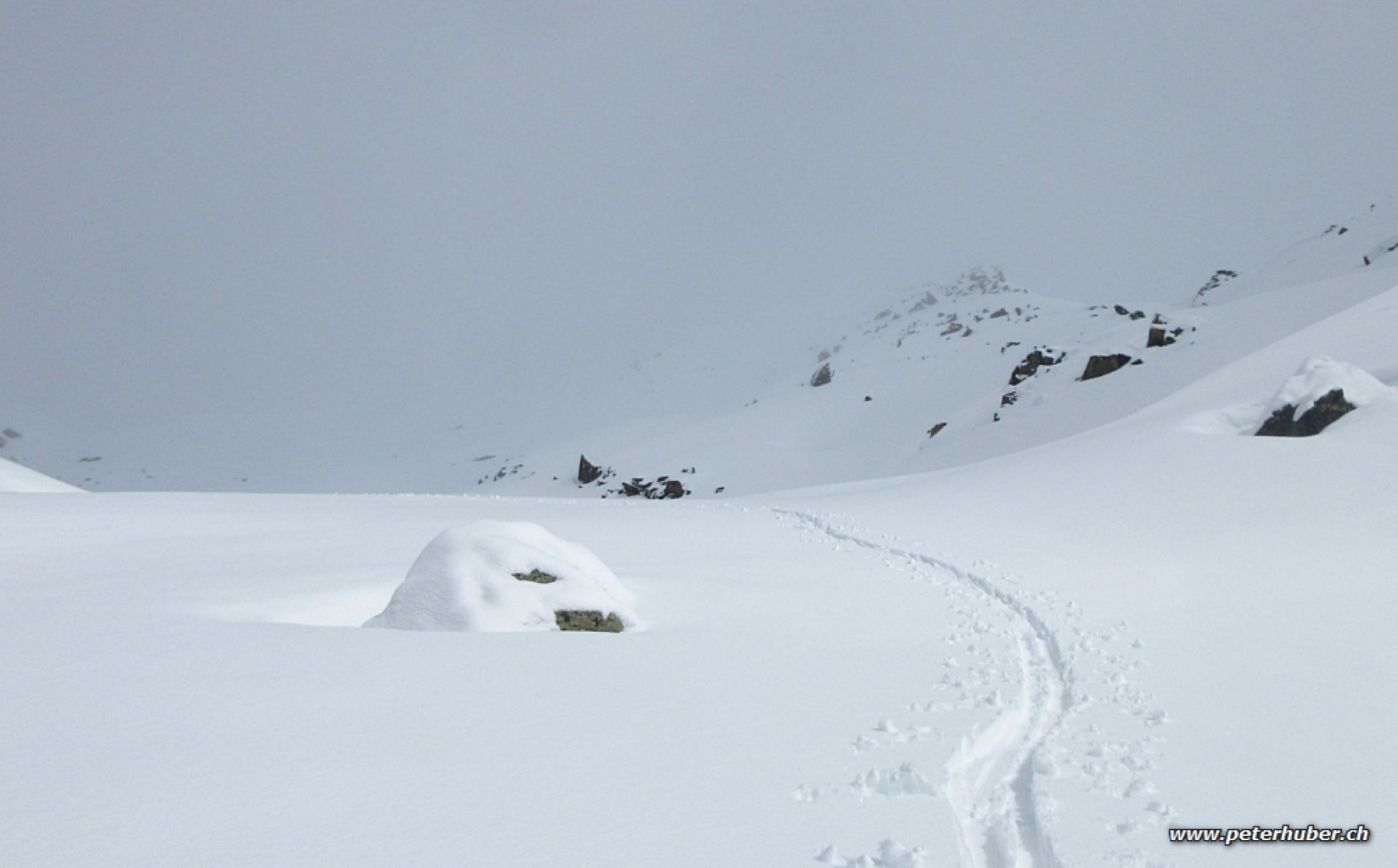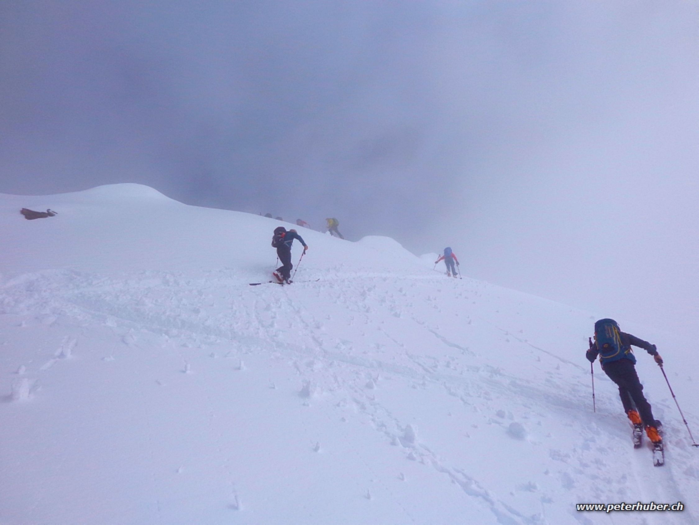 Dann bis ca. 2400 m weicher Schnee, wo wir beim Spuren gelegentlich mal 20 cm einsanken. Danke an die beiden Spurer vor uns. Darüber ca. 5 cm feuchter Neuschnee auf tragender Unterlage.