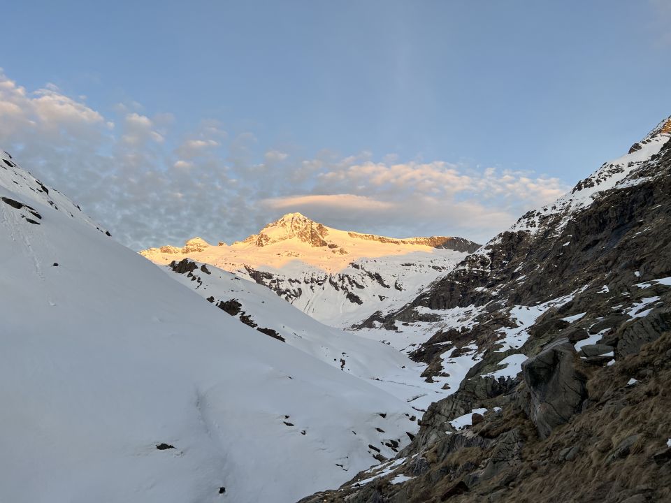 Wir waren ab Hütte ca. 20-30min mit aufgebuckelten Ski unterwegs, bevor wir anfellen und dank nächtlicher Abstrahlung schnell an Distanz und Höhe gewinnen konnten. Harscheisen waren nicht nötig. Kurz vorm Couloir zu Punkt 3133m wurde der Schnee weicher. Das Couloir, das man von der Hütte aus bereits wunderbar sehen kann, war gut eingeschneit und passierbar. Weiter oben kamen wir dann leider in dichte Wolken und waren für die Spuren ab Läntahütte vom Vortag dankbar.