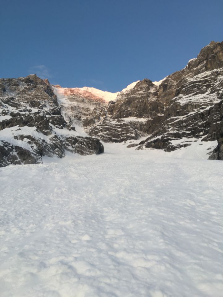 Wir starten von der Talstation um 3 Uhr. Der Schnee reicht zur Zeit noch durchgehend bis unten. Bis 2600m Schnee trotz klarer Nacht nicht vollständig durchgefroren, wie im Lagebericht richtig beschrieben. Mit Ski blieb man aber ohne Einbrechen auf dem Harschdeckel, zu Fuß kaum ein durchkommen möglich. Sehr großes Lawinen Trümmerfeld bei der Querung von der Bergstation Richtung tabarettahütte, das im Dunklen viel Zeit kostet. Am Beginn der Nordwand durch Lawinen verhärteter Schnee, der ein Schnelles vorankommen ermöglicht. Wir drehten trotzdem auf 2800m um, da für uns der einzige Abstieg durch die Minningerode-Rinne führt und wir am oberen Rand unserer Zeitplanung waren, wir hatten damit keine Sicherheitsreserven mehr. Ein Abstieg über den (Winter) Normalweg kam für uns aufgrund des nordseitigen Altschneeproblems nicht in Frage. Der Gedanken am Gipfel zu stranden hielt uns vor dem weitergehen ab.