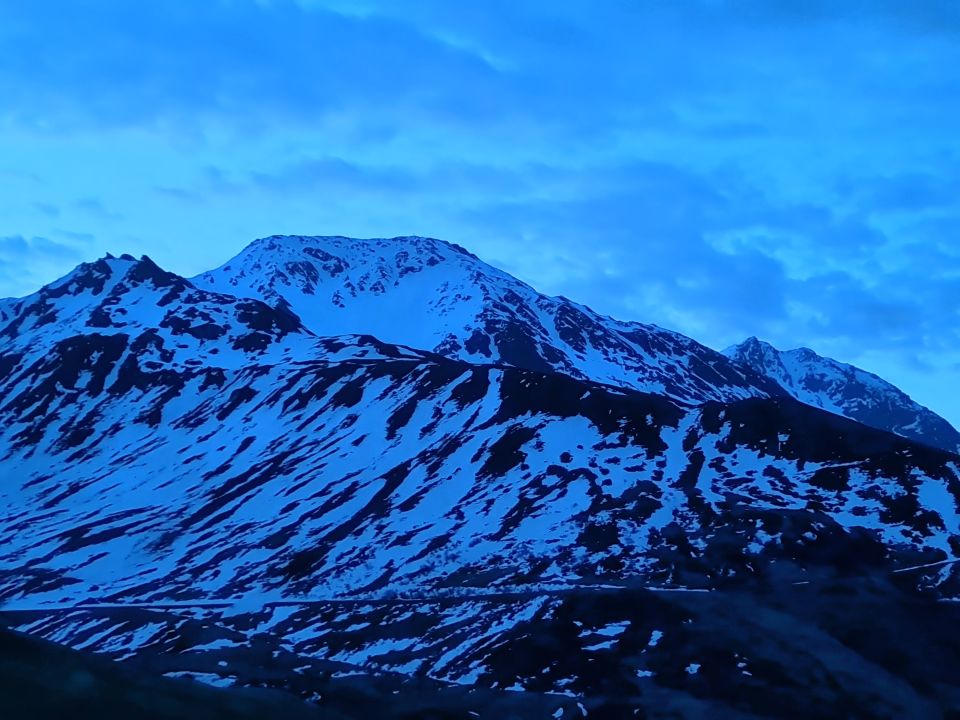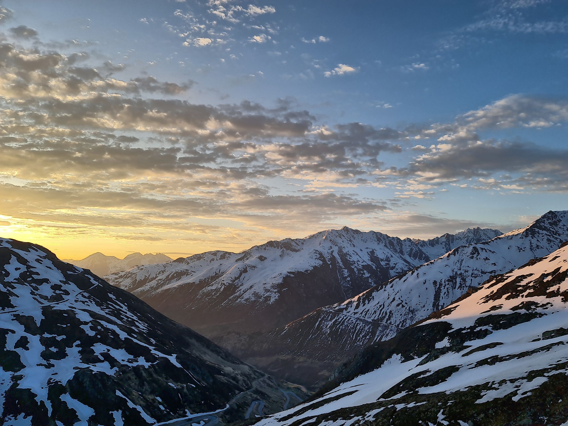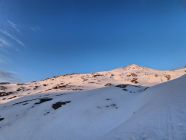 Schneedecke unter 2200 auch bei Sonnenaufgang nicht tragfähig gefroren. Darüber gute Verhältnisse. Traverse am Pazolastock gut machbar.