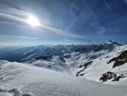 Gute Verhältnisse für die Abfahrt in der W-Flanke: Kompakte Schneedecke, nur wenig Lawinenbollen, ab 2500 wunderbar liebliches Gelände.
