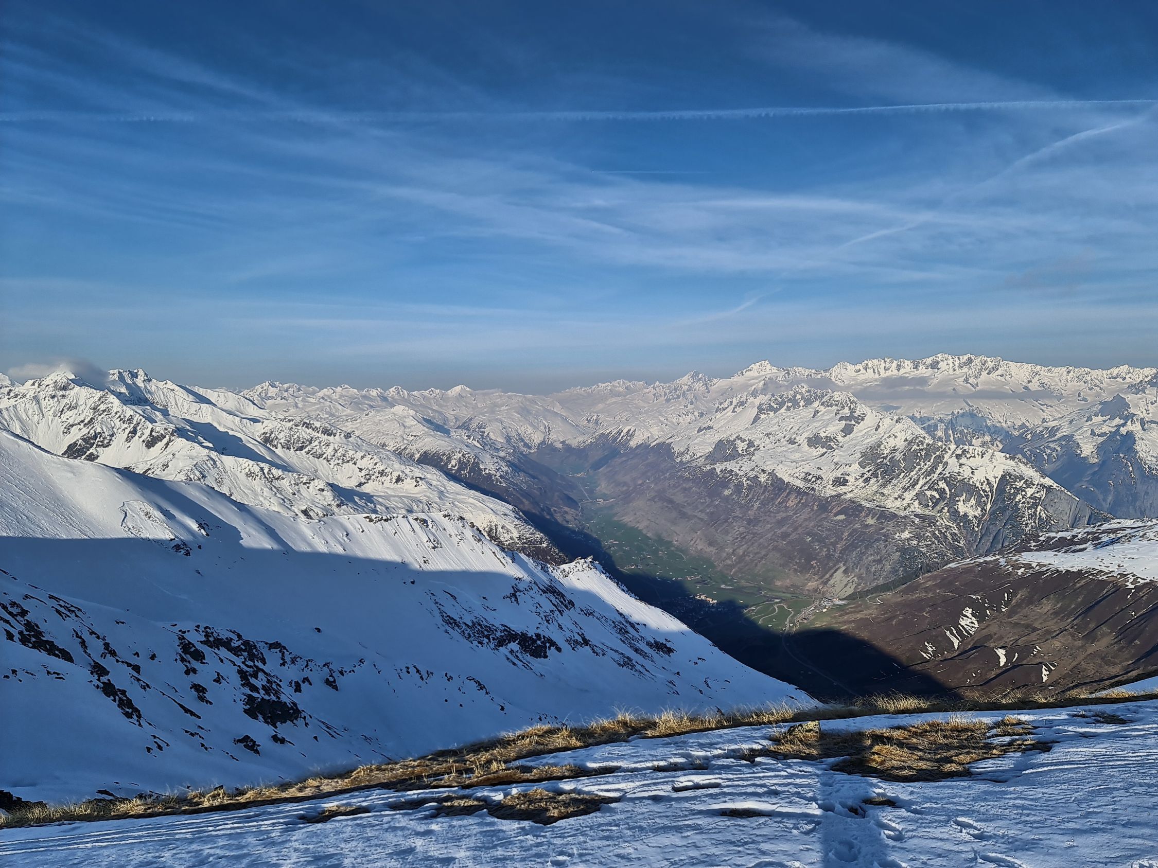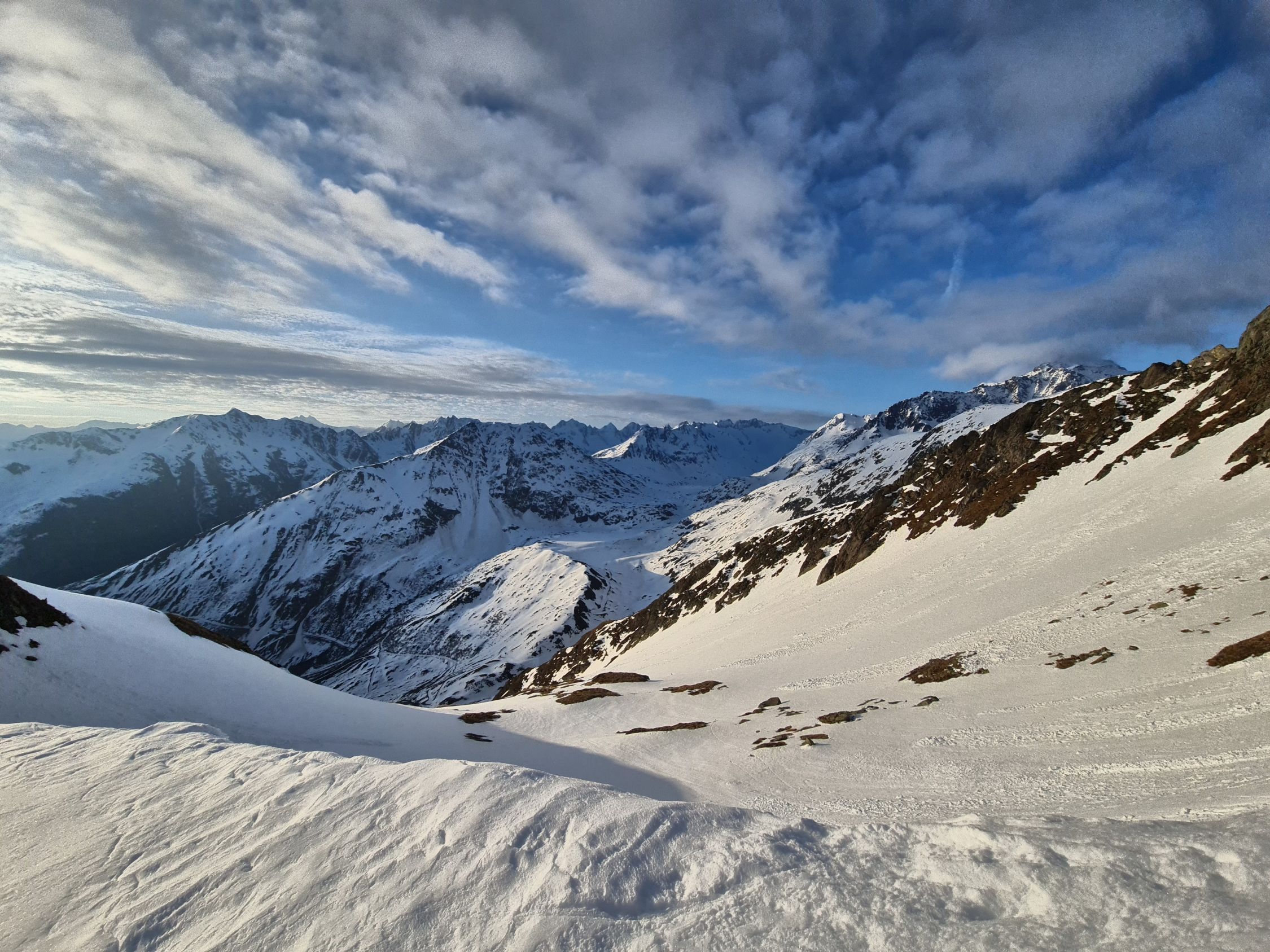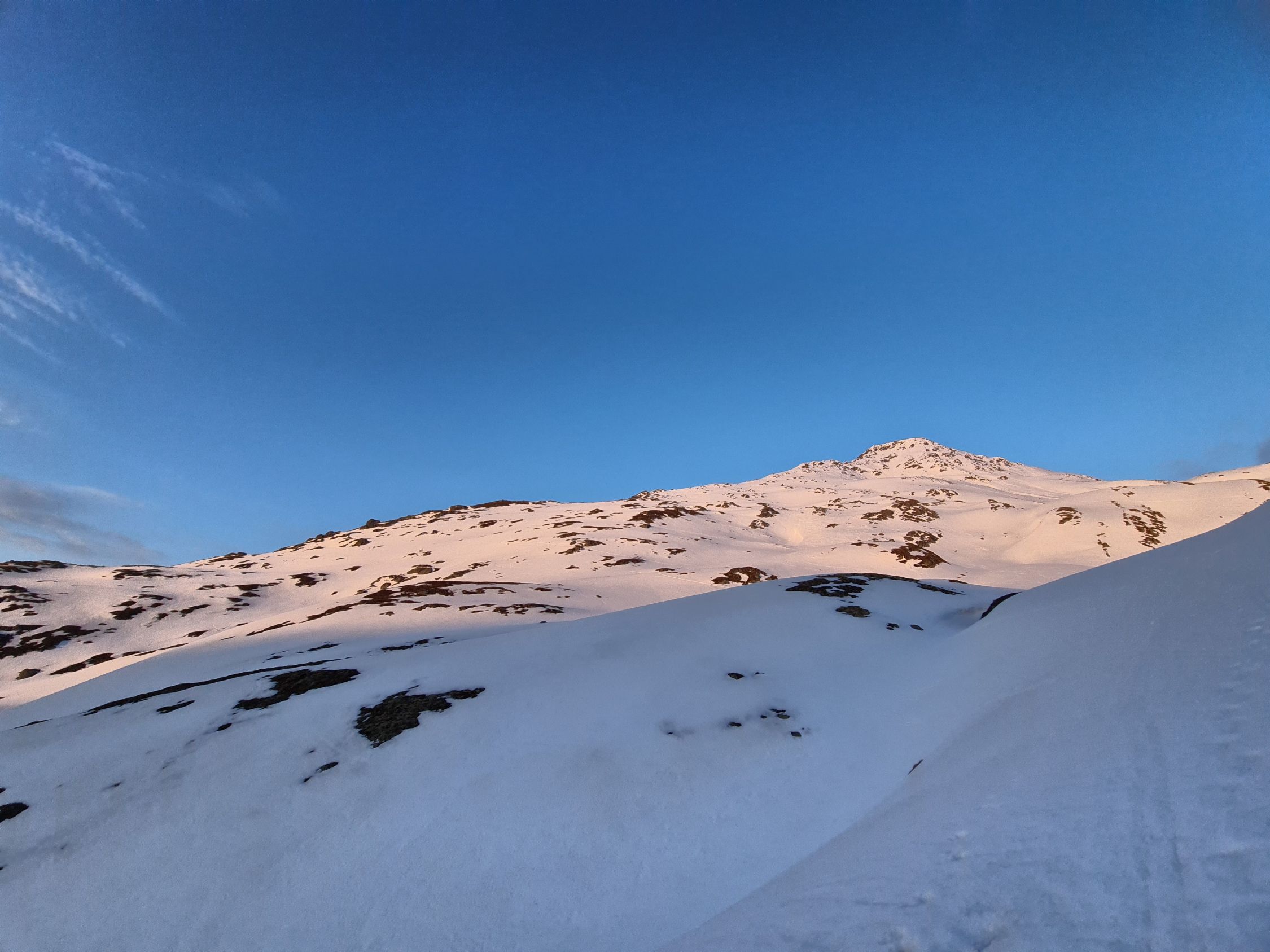In den steilen Hängen gegen die Oberalpreuss schon am frühen Morgen unter 2200 Sumpf, jedoch wenig Schnee. SW-seitig unter ~2000 aper.