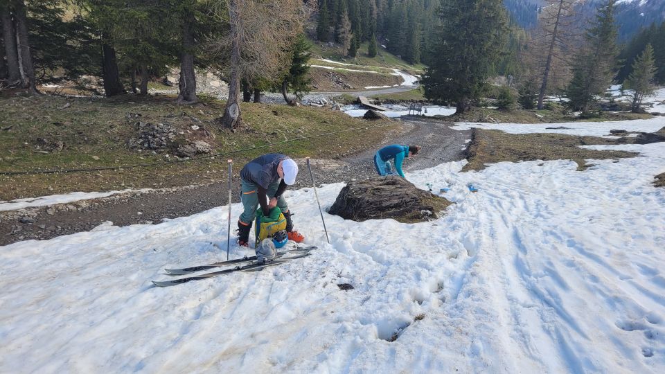 Das "gut" bezieht sich auf die Tatsache, dass es genug Schnee ohne Steinkontakt auf der ganzen Route gab und keinen Bruchharsch. Ich war aber überrascht, dass der Schnee bis zum Gipfel schon durchnässt war, in der Südseite des Wildhorns war es fast noch schlimmer als weiter unten. Der Schnee war okay zu fahren, aber zäh und anstrengend. Auf dem Hinweg sind wir im Schatten über den Iffigsee, auf dem Rückweg sind wir lieber aussenrum, da der Uferbereich schon ziemlich matschig war. Wir haben von der Iffigalp ungefähr 1 km getragen, bis zu der Stelle, wo der Wanderweg über den Iffigbach geht. Von dort an gibt es genügend Schnee.