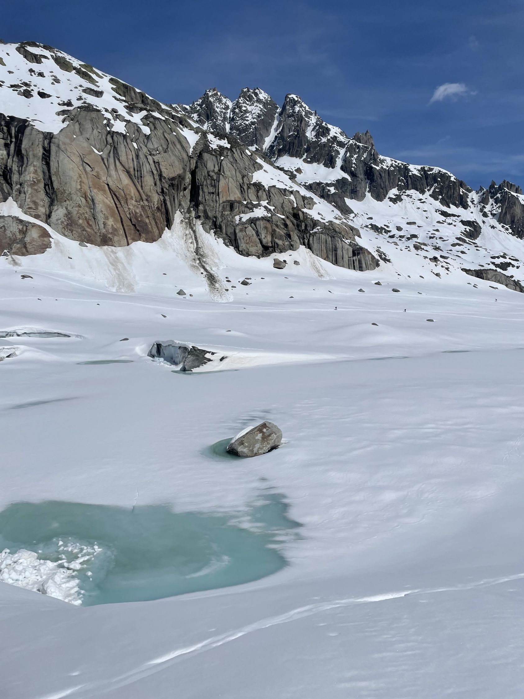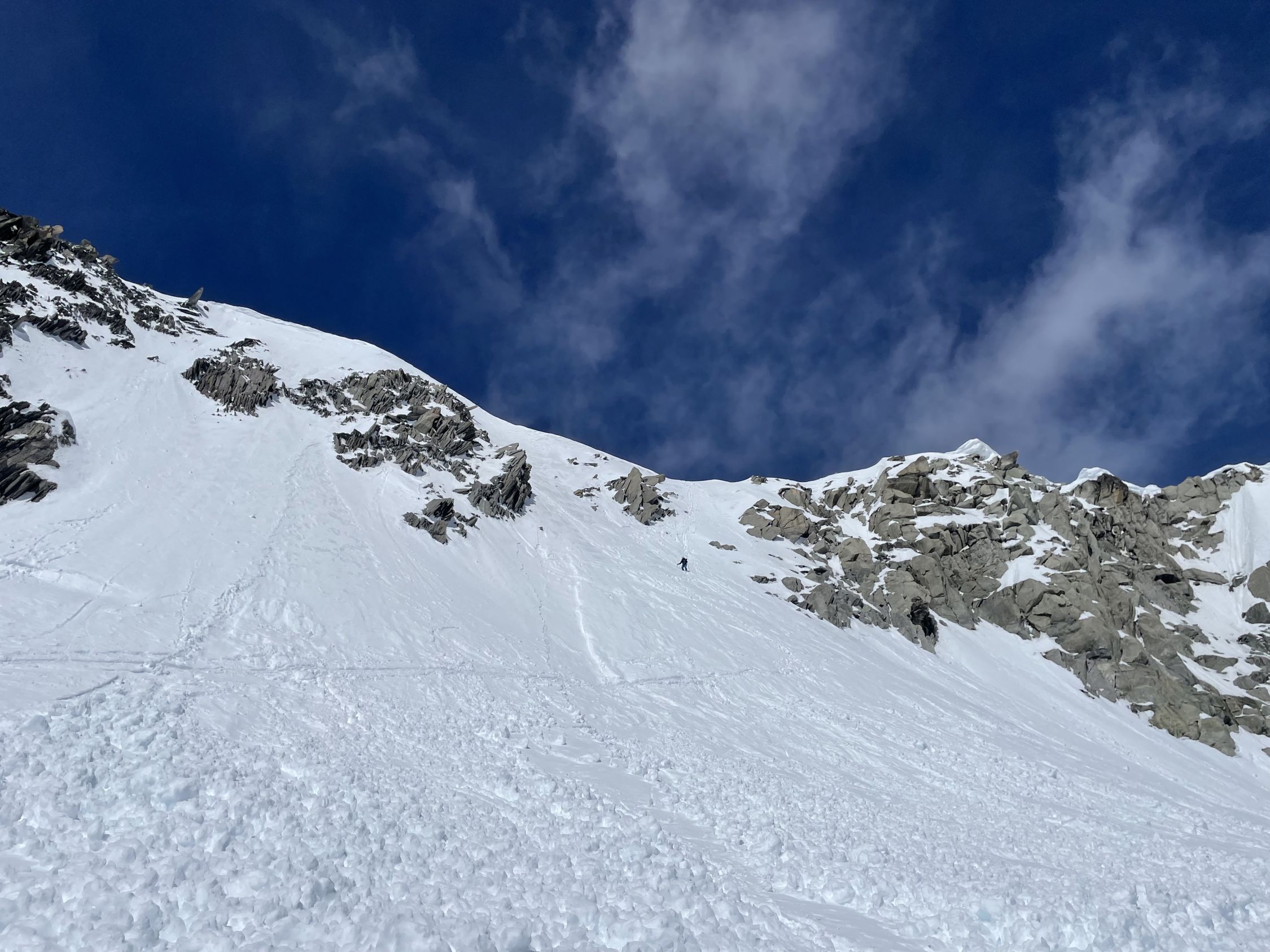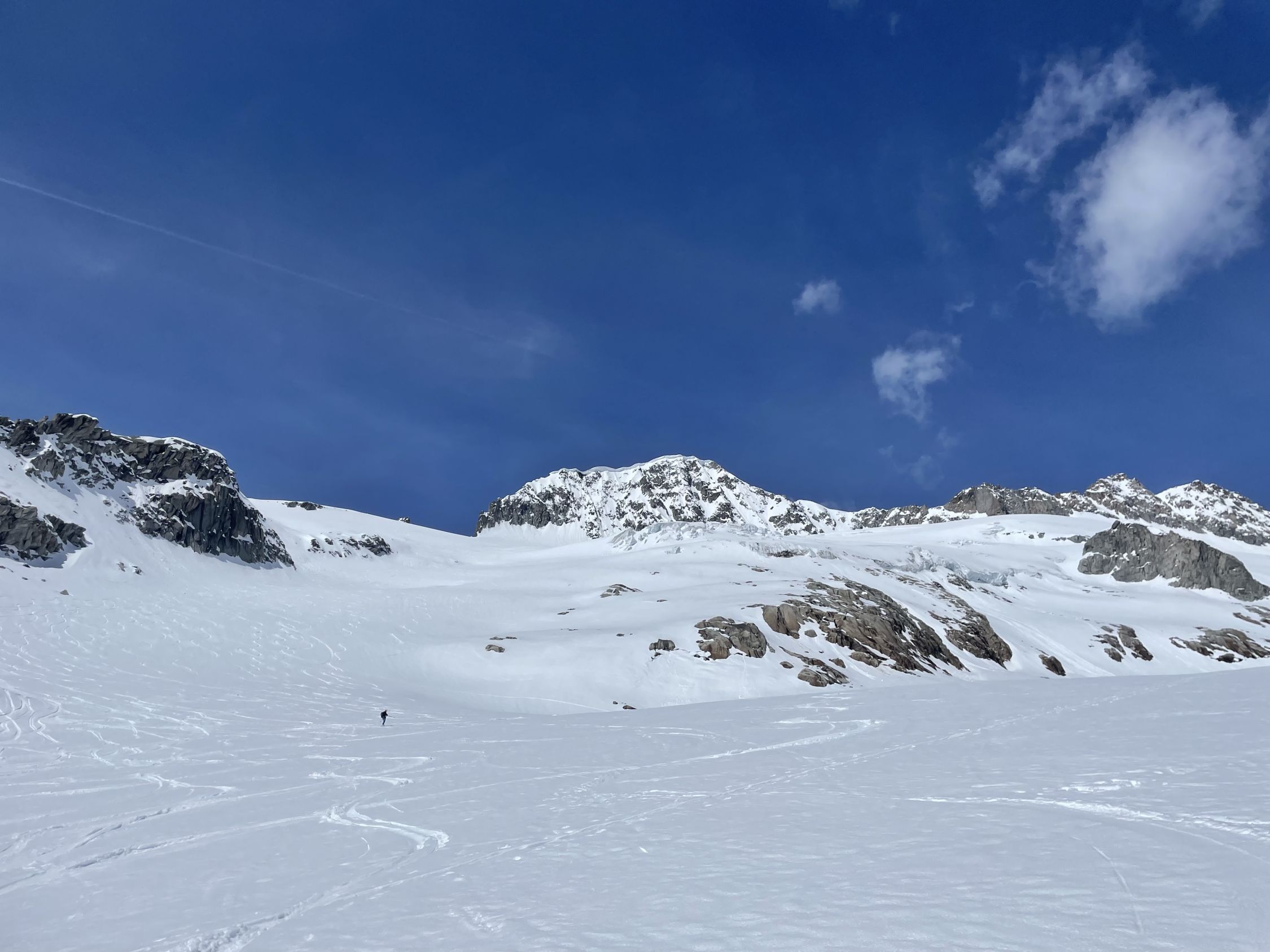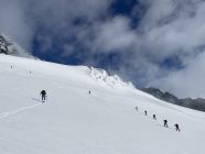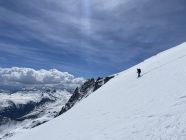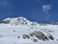 Ganze Route gut eingeschneit. Die Abfahrt war bis an die Passstrasse möglich. Der Schnee ist bis in tiefe Schichten durchnässt, aber gut tragend im Aufstieg. Alles ohne Harscheisen möglich. In der Abfahrt kam der Schnee bei grösserer Steilheit schnell ins Rutschen. Steilflanke aber noch gut machbar - wurde auch mit Skis gefahren. Auch das lange Couloir wurde gefahren. Aufstieg über Nordgrat mit Steigeisen und Pickel gut zu machen.