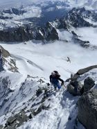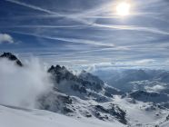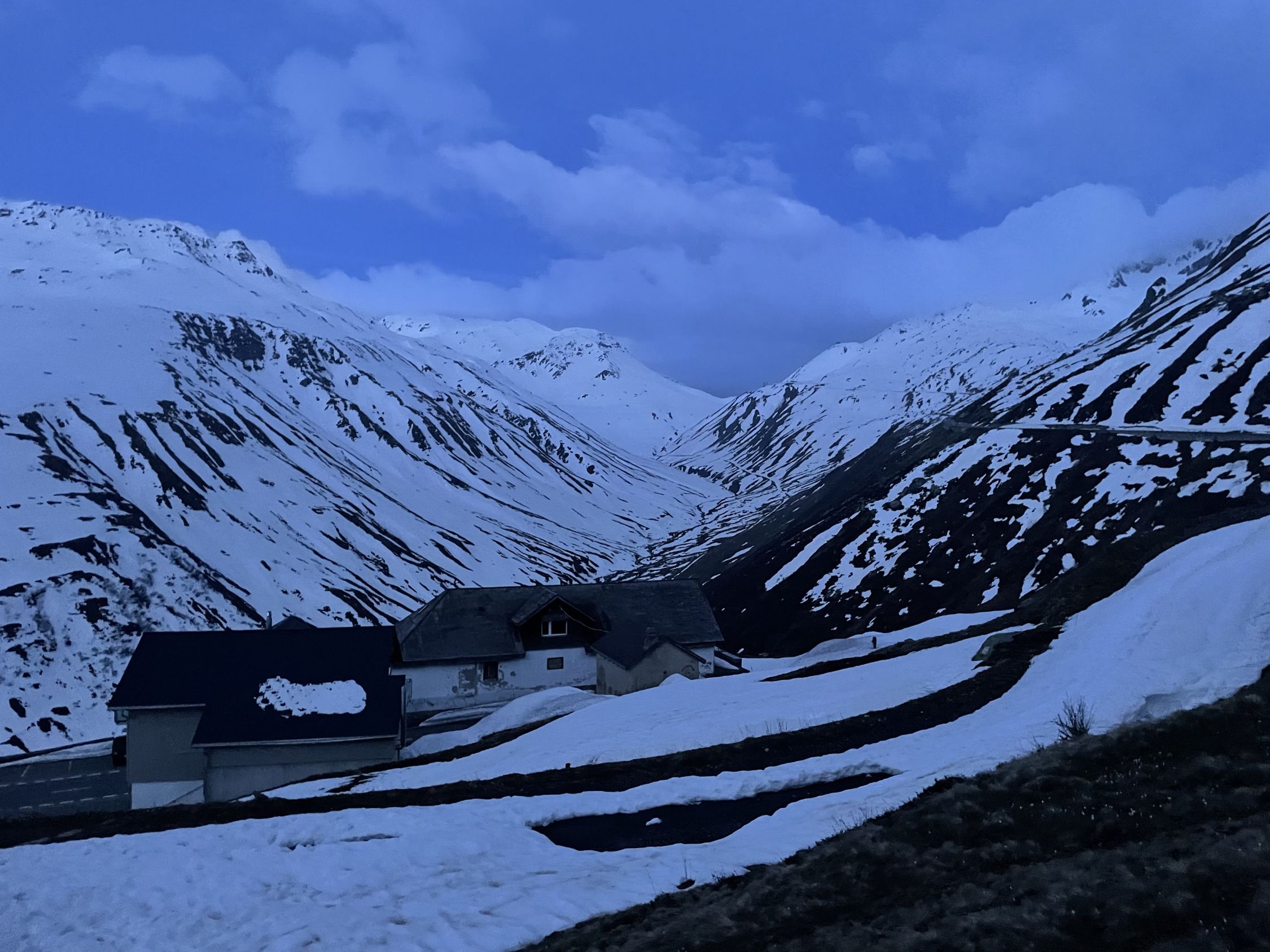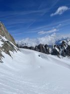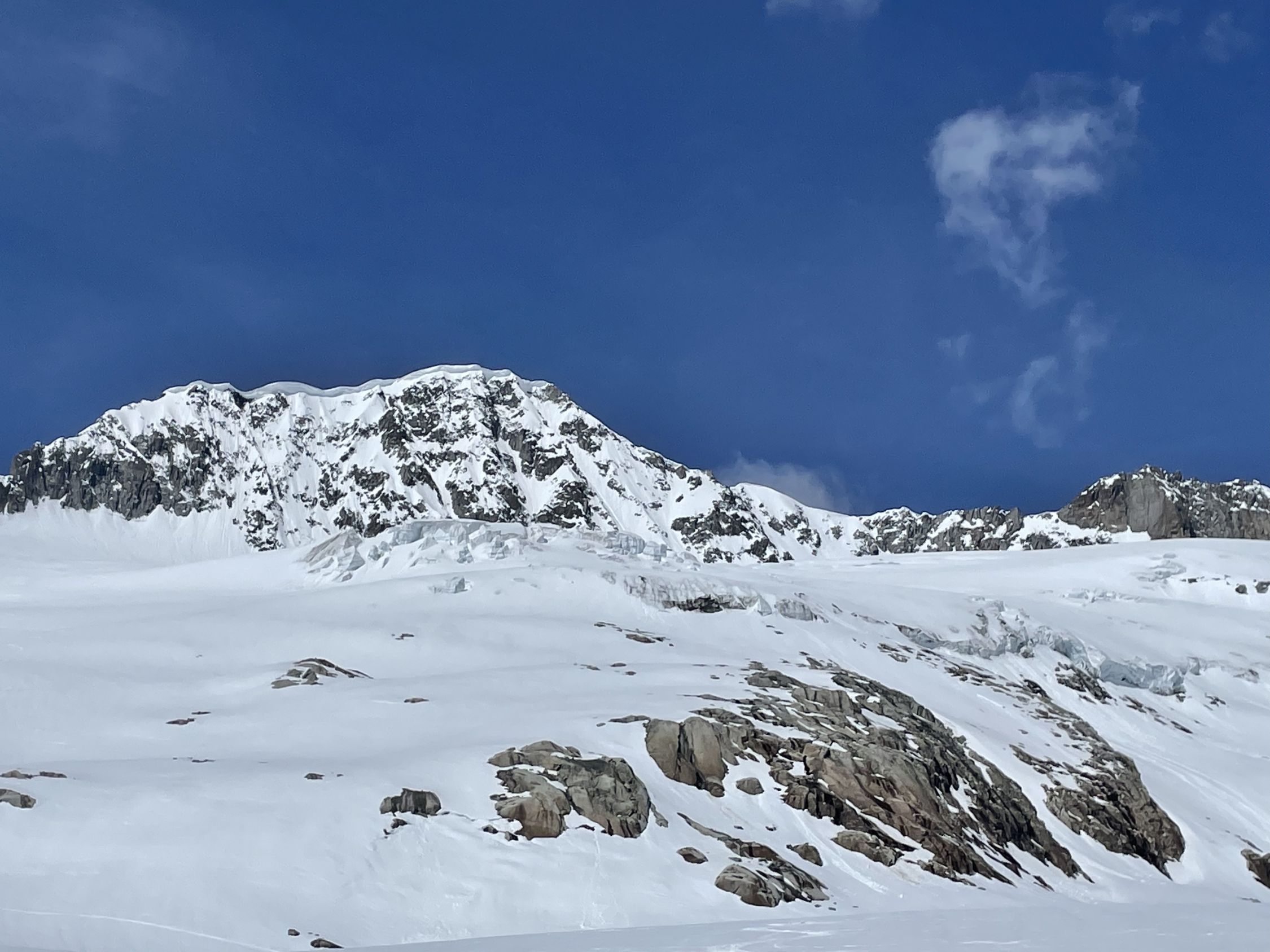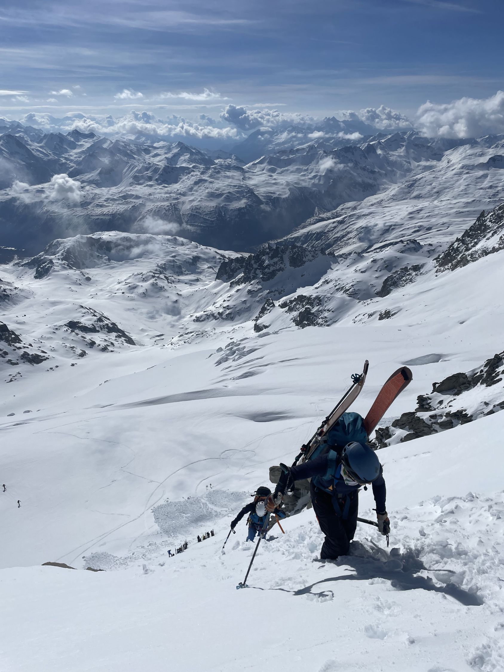 Ganze Route gut eingeschneit. Die Abfahrt war bis an die Passstrasse möglich. Der Schnee ist bis in tiefe Schichten durchnässt, aber gut tragend im Aufstieg. Alles ohne Harscheisen möglich. In der Abfahrt kam der Schnee bei grösserer Steilheit schnell ins Rutschen. Steilflanke aber noch gut machbar - wurde auch mit Skis gefahren. Auch das lange Couloir wurde gefahren. Aufstieg über Nordgrat mit Steigeisen und Pickel gut zu machen.