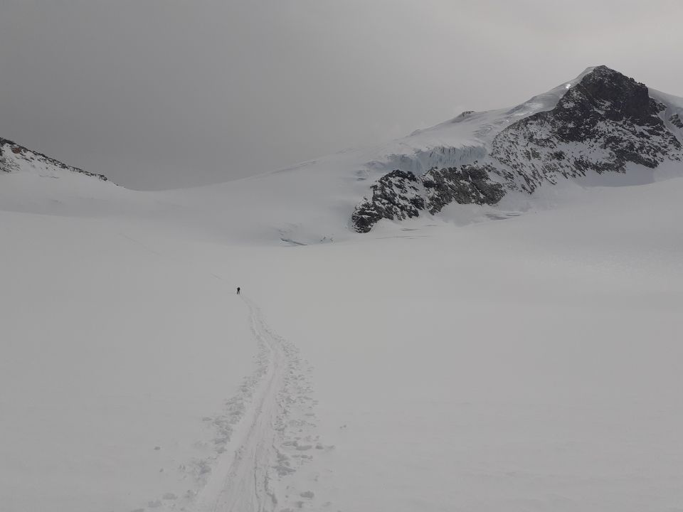 Tag 2: Ab der Hütte gute Spur. Gletscher ist recht gut eingeschneit; auf dem ersten Stück auf dem Turtmanngletscher nach der Hütte sind die Spalten jedoch sichtbar. Ab 3600m mehrere Blankeisstellen, die aktuell noch problemlos umgangen werden können. Harscheisen von Vorteil. Skidepot wenige Meter vom Gipfel, der gut ohne Steigeisen erreichbar war.