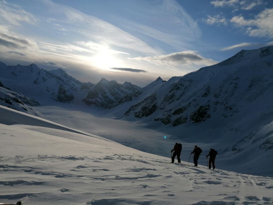 Die Gletscher sind gut eingeschneit und es ist alles eingespurt. Aktuell kann ohne Harscheisen aufgestiegen werden, das kann sich aber schnell ändern. Die Schneequalität ist mittelmäßig, alle 4 Jahreszeiten eben. Es braucht den "routinierten" Skifahrer. Mit etwas Gespür und einem guten Auge findet man aber genug brauchbar gute Abfahrtsmöglichkeiten. Waxen hilft! Aktuell reicht der Schnee mit 5 Trageminuten bis knapp vor Fafleralp. Der Taxibus fährt stündlich immer um halb ab 12.30 Uhr.