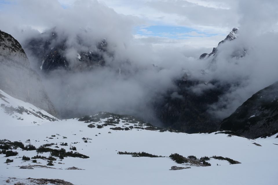 Völlig einsam heute trotz passablem Wetter bis zum frühen Nachmittag. Keine Radlfahrer, nicht mal Motorradler, nicht mal alte Schispuren im Kar. In 4,5 Stunden ab der Grenze bequem machbar.