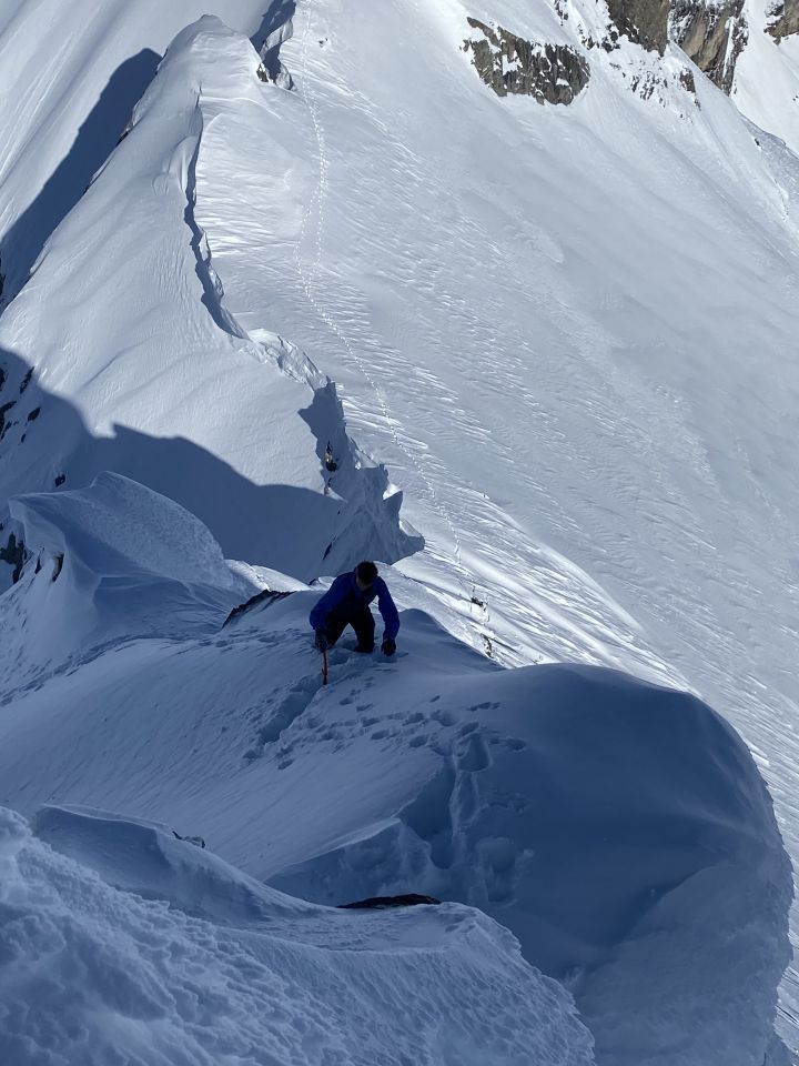 Abfahrt zuerst tragender Presspulver, dann schöner Pulver, dann etwas schwerer Pulver aber gut fahrbar bis zum Pass!