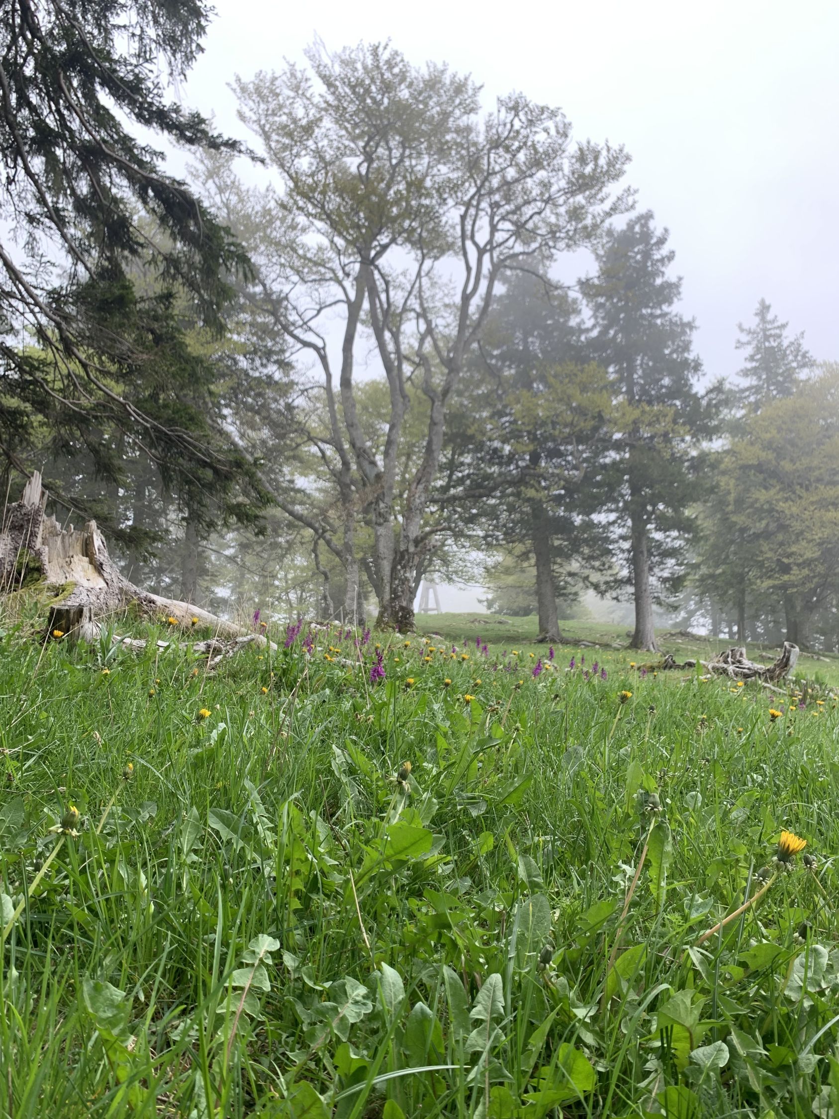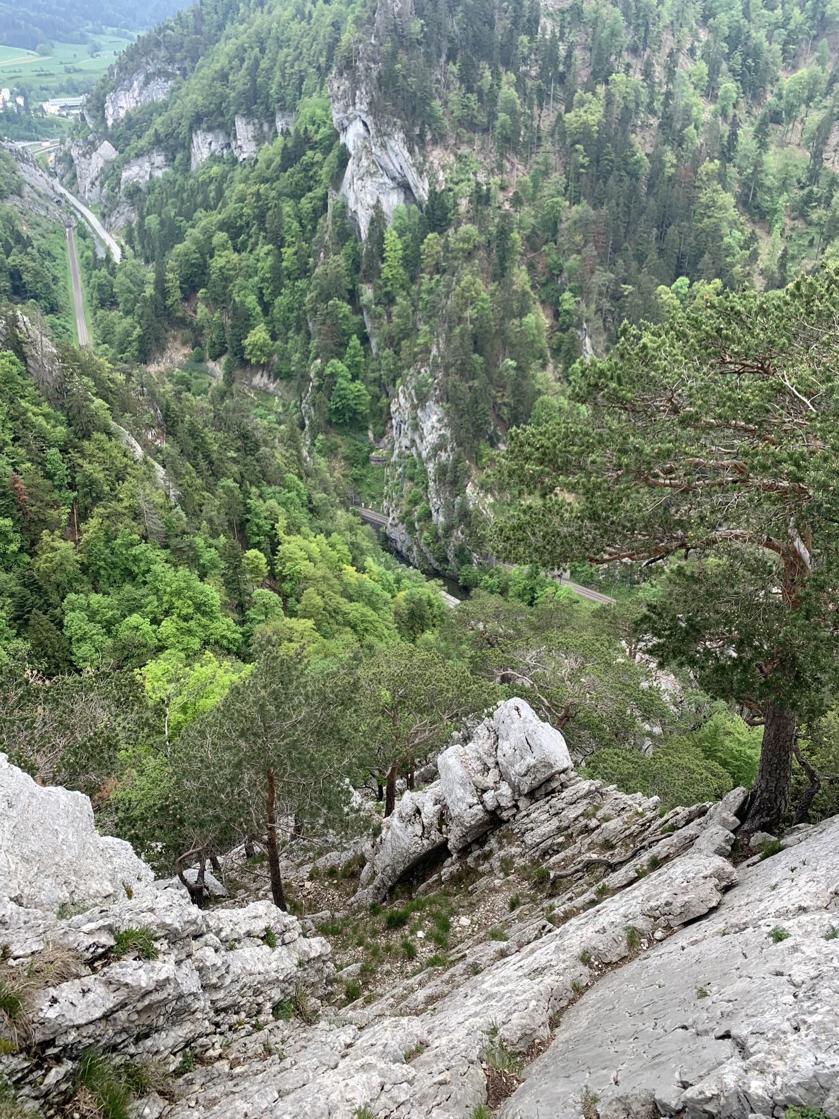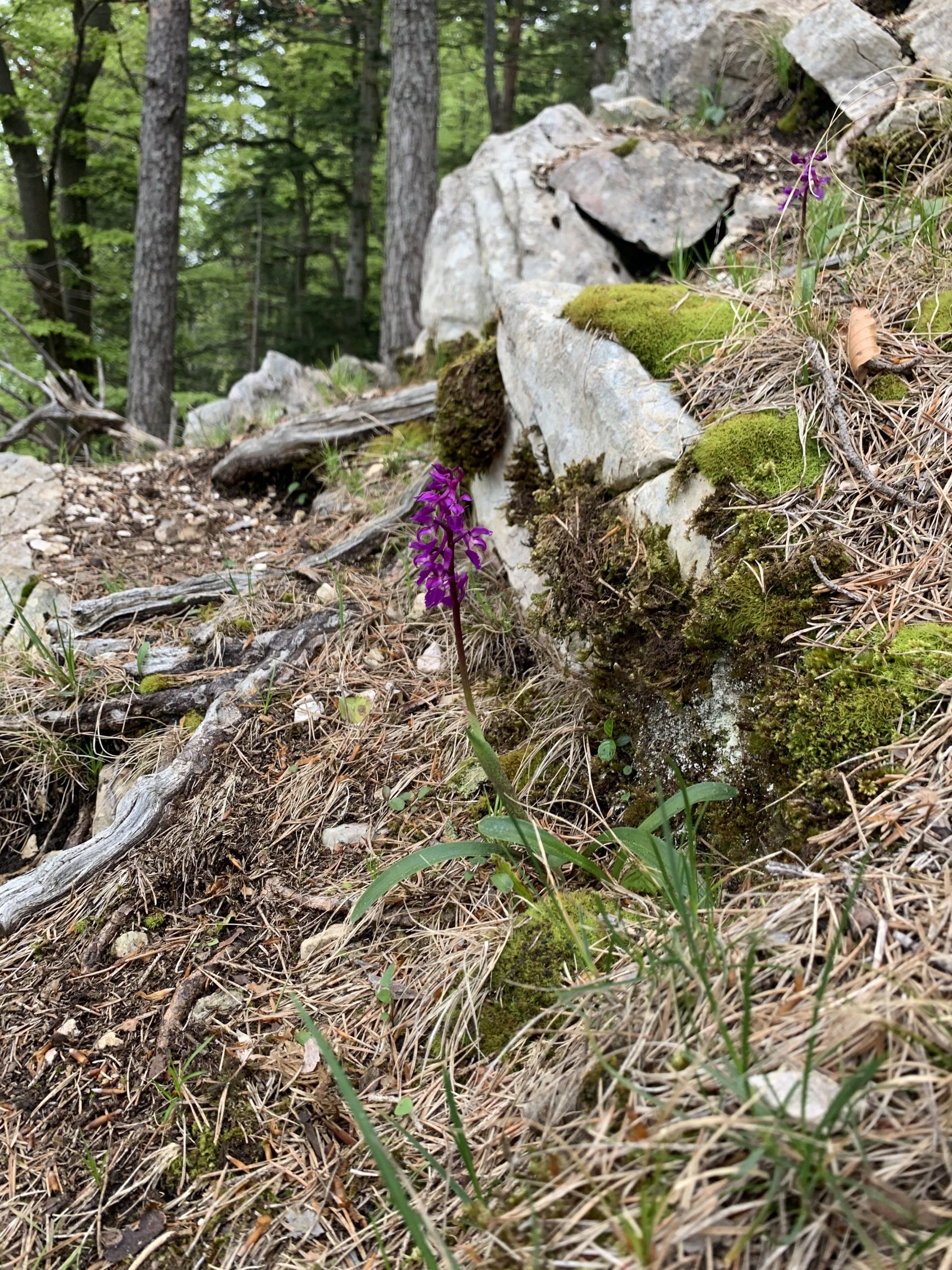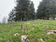 Ein traumhaft schöner Jura-Grat, T6-, Stellen 3. Die Abseilstelle bin ich auf dem Band südseitig umgangen, das ist umschwierig, aber exponiert. Zum Abseilen reichen 15 m Seil sicher aus, geht so wohl einfacher. Die Angabe im Routenbeschrieb "der Grat verliert sich oben im Wald und wird uninteressant" kann ich so nicht teilen. Es hat bis zum Ende schöne Stellen, landschaftlich alles superschön, oben im Grat mit Aurikeln und einigen Knabenkrautexemplaren, ganz oben am Turm dann ganze Knabenkraut-Wiesen.