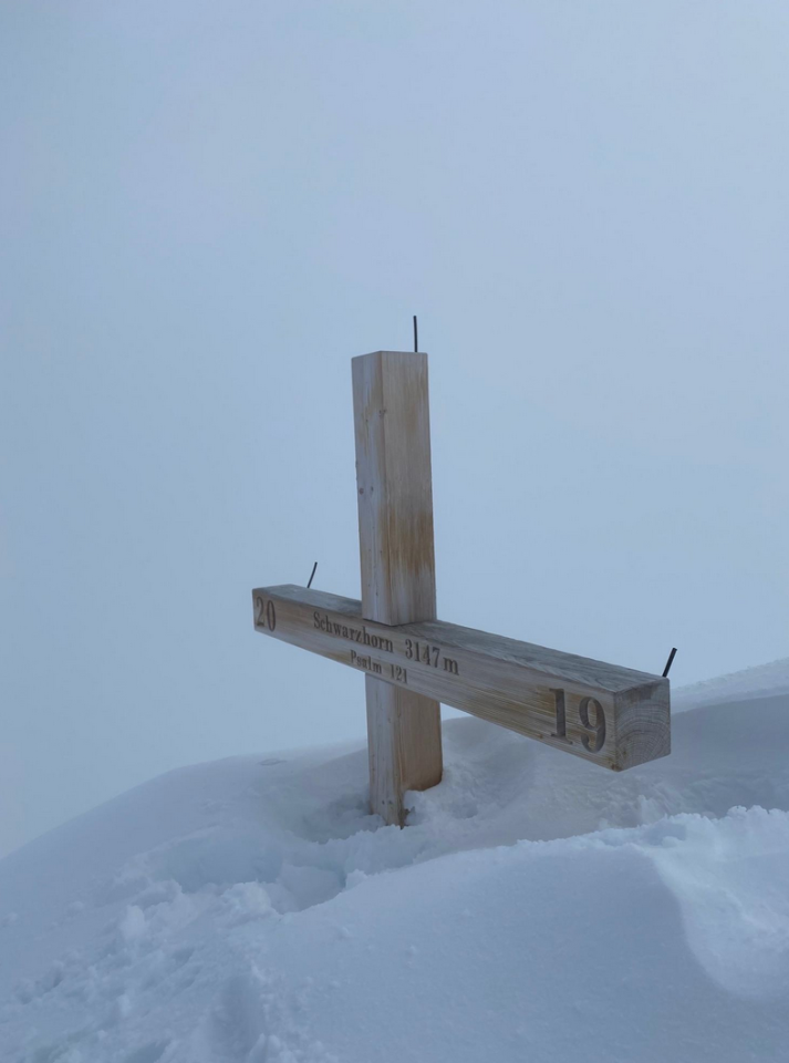 Recht hohe Temperaturen und bedeckter Himmel während der Nacht lassen den Schnee schon früh weich werden. Es hat noch recht viel Schnee im Gebiet und Aufstieg auch über die Steilstufe nach der Schwarzhornfurgga ist gut zu mit Ski zu begehen. Abfahrt (10 Uhr) vom Gipfel zunächst im Nebel, dann relativ gute Sicht mit nassem aber recht gut fahrbarem Schnee bis zu Passstraße.