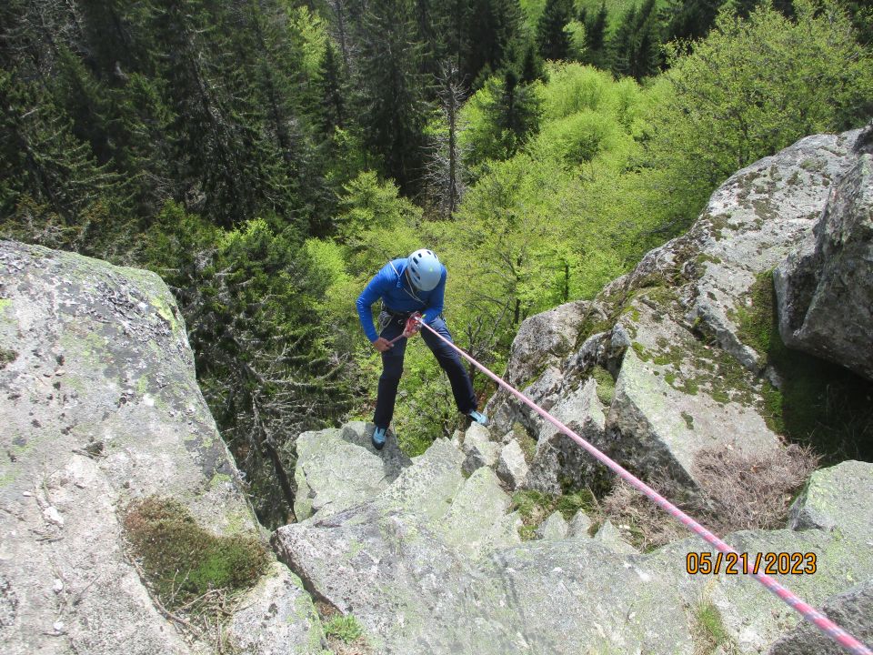 Nur mal kurz waren wir zu Gast im netten Klettergarten. Mit frühzeitigem Einstieg gegen 8.30 h waren wir zunächst allein. Bald schon aber trafen zwei größere Gruppen ein, und somit wurde es eng. Die von uns favorisierten Routen waren dann alle belegt, und da wir keine Lust auf Anstehen hatten, eine zeitige Rückfahrt ohnehin geplant war, und wir auch schon etwas müde waren von den Aktivitäten der zurückliegenden Tage, entschieden wir uns zu einer Einkehr nach elsässischer Art in der Ferme Auberge Seestädtle.
