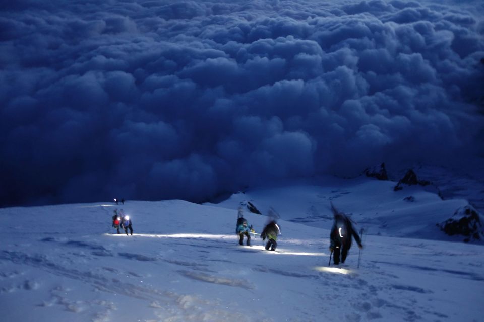 Abfahrt ab Gipfel die gesamte Nordflanke bis zum Grand Plateau anfangs Oberflächenreif, dann fester Pulverschnee. Unterhalb von 4100m harter Schnee, ab 3000m weich, unterhalb 2900m Pflotsch.