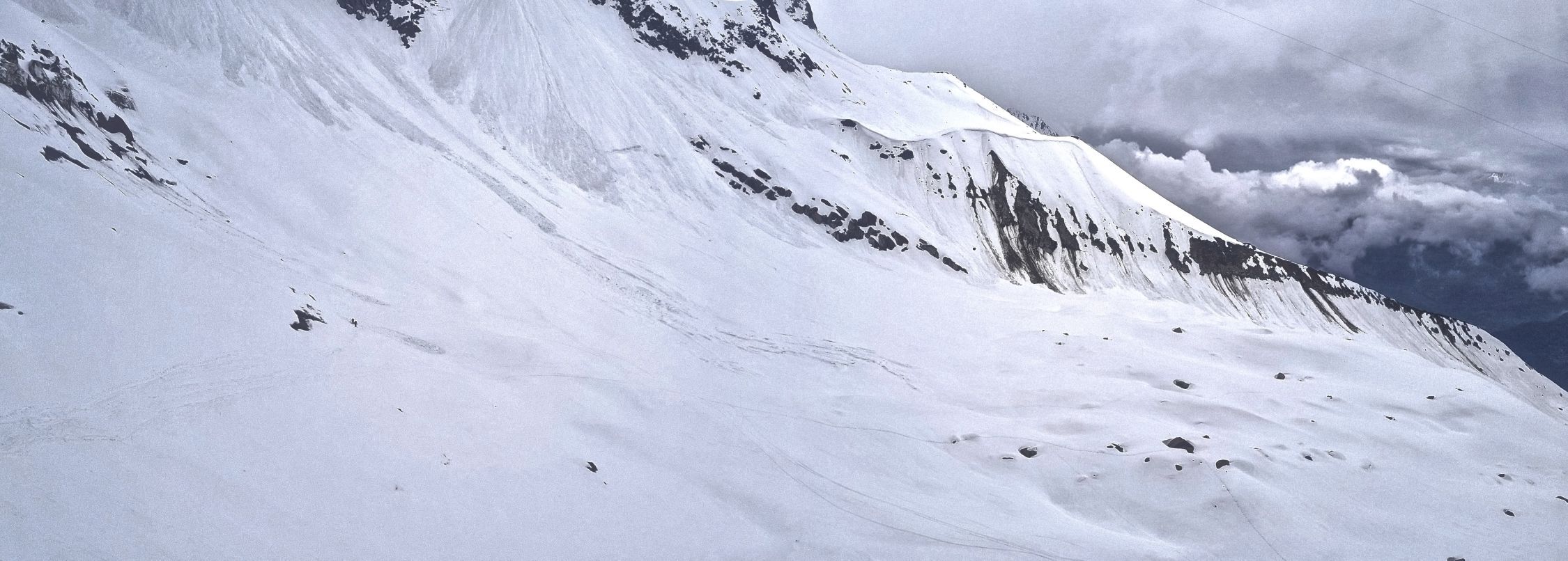 Nasschnee und Pflotsch, darüber die Lawinenkegel diverser Nasschneelawinen.