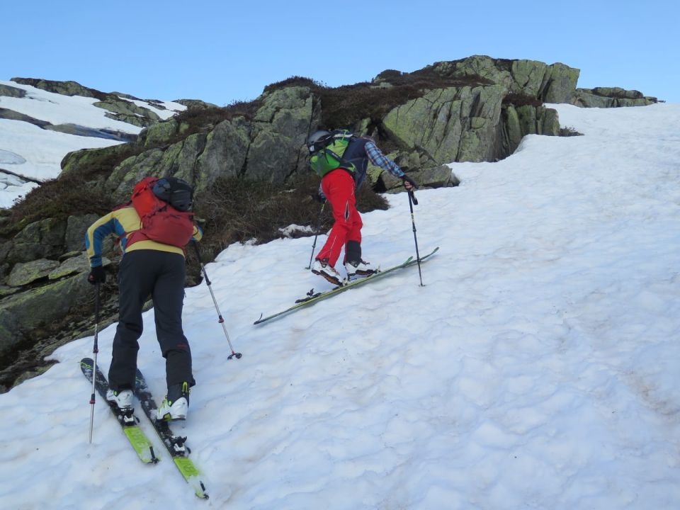 Im Aufstieg nach der Staumauer zuerst bis ca.1900m über den Bergweg. Anschliessend durchgehend Schnee bis Skidepot. Im Aufstieg hart bzw. teilweise bereits leicht aufgesulzt, aber sehr gut zu gehen. Für den Gipfelgang dann das Schneecouloir benutzt und nur ganz oben auf die Felsen ausgestiegen. Die Felspartie ist nicht ganz ohne(Plattiger Fels mit Tourenskischuhen...).