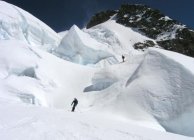 Abfahrt durch wild Gletscherabbrüche des Anungletschers. Östlich an der Anenhütte vorbei zum Gletscherstafel. Von dort z.T. Ski getragen oder auf den letzten Schneeresten gefahren bis nach Blatten.