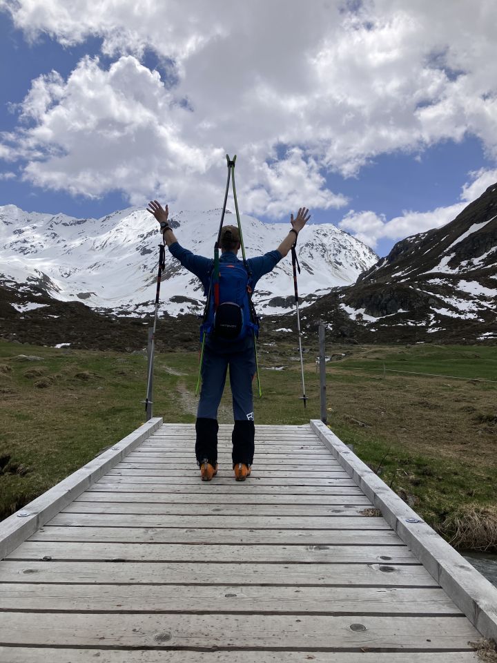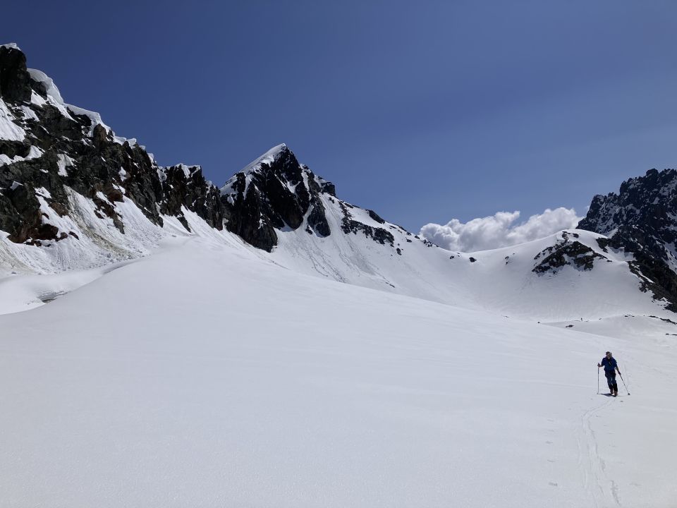 Dann retour und Wiederanstieg zu P 2981 mit anschließender Nordabfahrt. Klasse aufgefirnt, weiter unten stark von Lawinen bestrichen. In der Nordflanke des Scarlettahorns kann man noch den Anriss aus dem letzten AvaBlog besichtigen.