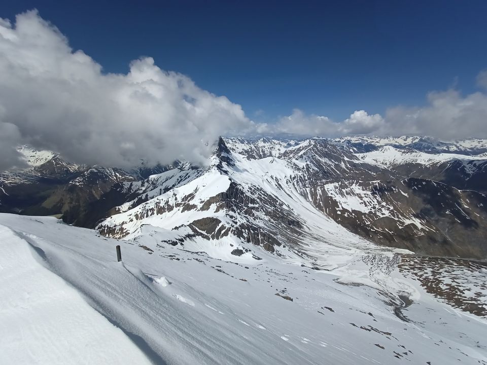 Super Verhältnisse am Muttler. Der Berg ist im oberen Bereich bestens eingeschneit. Kleine Krux - man muss eine gute Stunde die Ski durchs Val Maisas tragen. Aktuell kann man auf etwa 2250 m anschnallen (etwas südlich des Sommerwegs). Abfahrt vom Gipfel wäre möglich, wegen der Lawinenboller aber nicht wirklich lohnend. Mein Skidepot war auf ca. 3200 m vor dem letzten Aufschwung des Nordgrats.