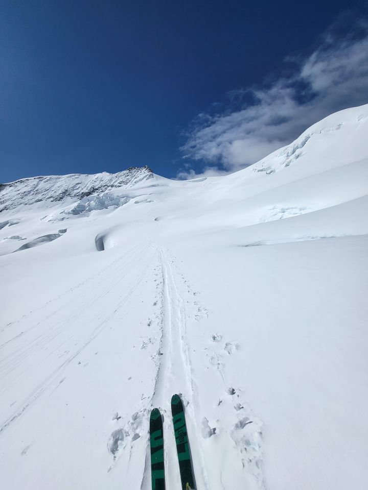 Aufstieg unter Rottalsattel zum Teil mühsamer Schnee, ansonsten sehr gut. Bergschrund gut machbar. Flanke geht rechts super da top Trittschnee, Sicherungsstangen links nicht gebraucht. Sind danach in guter Spur via Lowitor (sehr gute Abfahrt) und Lötschenlücke (geht noch so) bis ca. 2000müM gefahren. 2 mal.über Lawinenkegel Skitragen. Ab da wandern bis Gletscherstafel.