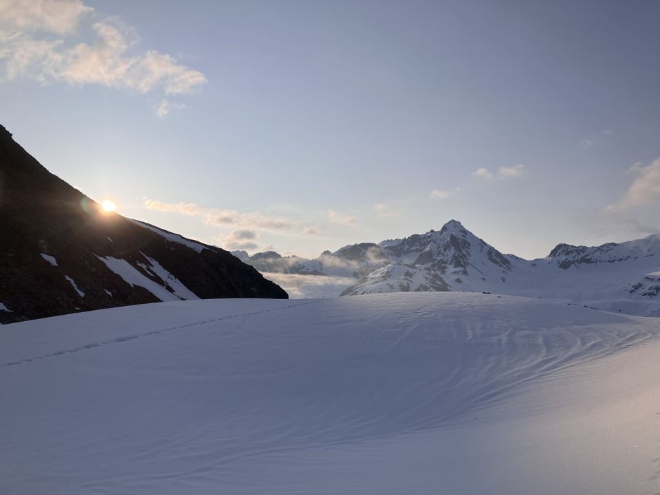 Ski tragen bis 2300 m. Dann dank guter Abstrahlung gut zu gehen. Flanke zum Gipfel steil und hart, aber ordentliche Tritte. Abfahrt bis auf 2300 m und Wiederanstieg zur Grialetschhütte.