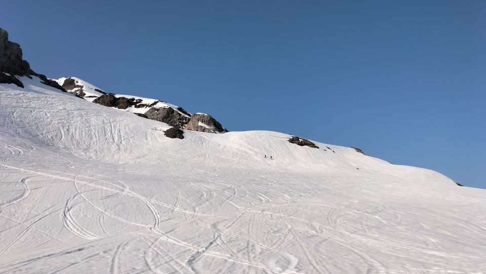 Start der Tour am 6.30 Uhr beim Klausenpass, die Temperatur heute + 7 Grad, dank einer klaren Nacht aber gute Abstrahlung, die Ski konnten sofort montiert werden , immer noch unten genügend Schnee bei richtiger Routenwahl, beim Iswändli dann die erste Schlüsselstelle, viele gingen dort mit Steigeisen hoch, ganz rechts gings aber auch etwas heikler mit Ski und den Harscheisen, zum Skidebot hoch wieder beste Verhältnisse, weiter mit Steigeisen und Pickel über eine gute Schneespur zum Vorgipfel , die Kette zum Hauptgipfel an einer Passage kurz Schneebedeckt.