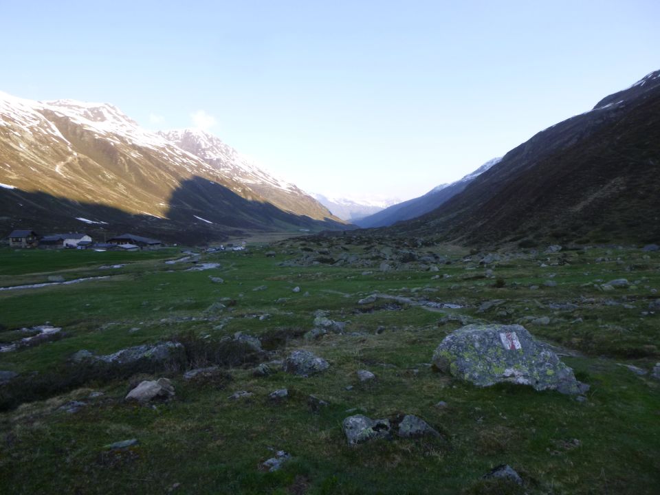 Wir stiegen vom kleinen Parkplatz im Dürrboden um 07:40 Uhr bei 4°C unter wolkenlosem Himmel auf mit vollem Gepäck anfangs dem Sommerweg folgend, dann auf halber Höhe nach rechts ins Bachtal orientierend, wo wir die Schneeschuhe dann anschnallten. Mit diesen dann zum Furggasee aufsteigend und zur ersten Sichtstange. An der Hütte dann um 08:40 Uhr angekommen. Wir waren die ersten dort. Alles soweit eingerichtet. Bloß noch nicht angeheizt.