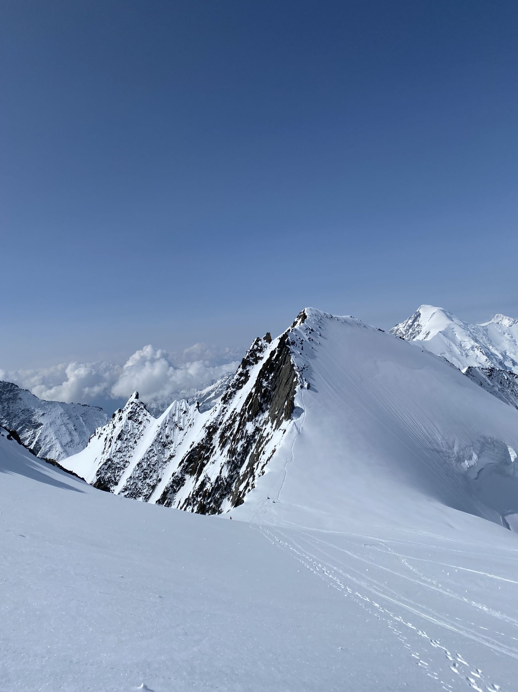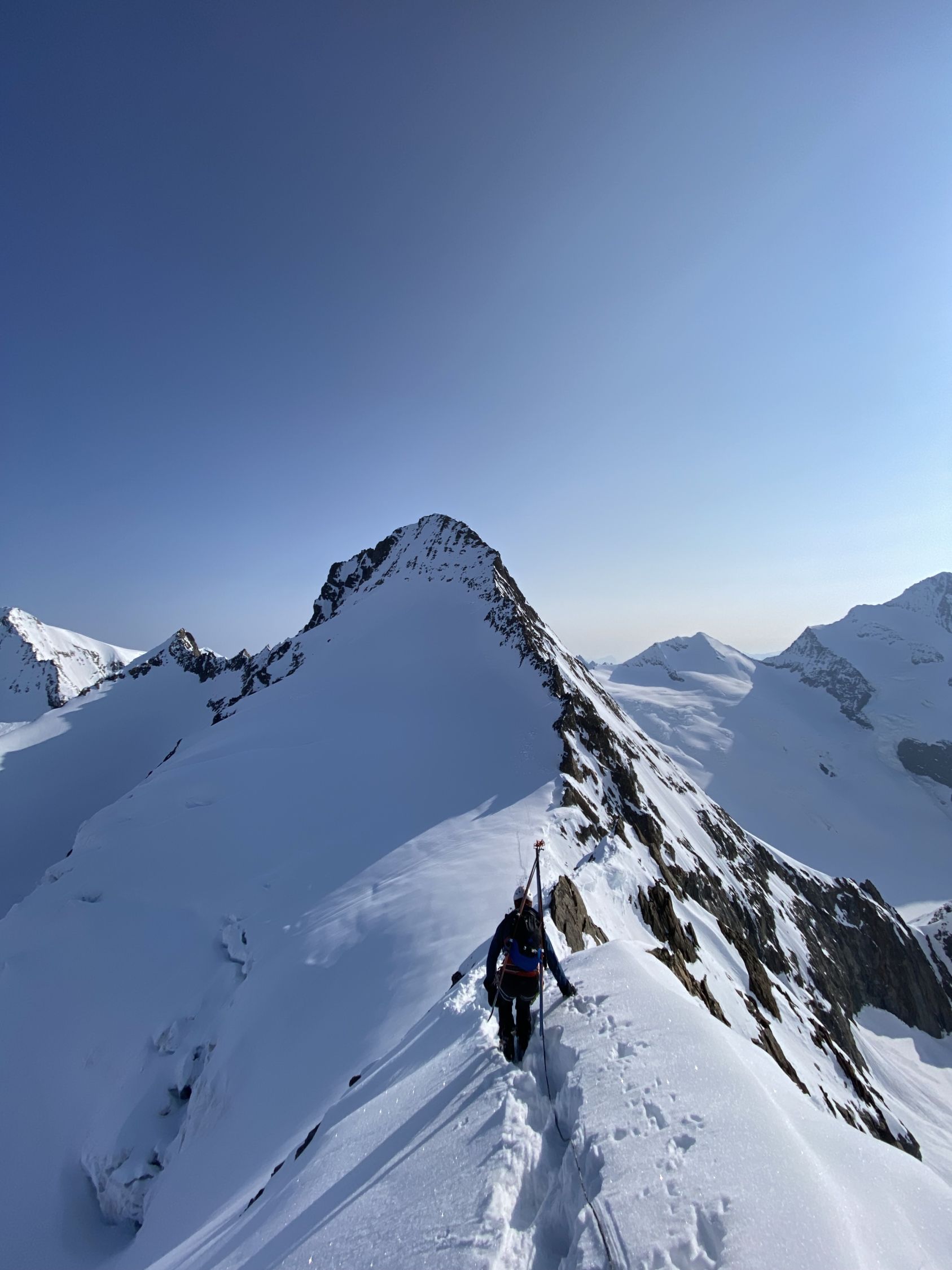 Aufstieg von der Finsteraarhornhütte über Grünhornlücke. Guter Trittschnee in der Steilstufe. Die Überschreitung des Grünegghorns ist ausgesetzt, aber sehr gut machbar, auch hier Trittschnee ohne blanke Stellen bis runter zum Sattel vorm Grünhorn, wo wir Ski und Rucksäcke deponiert haben. Gipfelaufstieg ohne Probleme und im Vergleich zur vorherigen Überschreitung wesentlich gutmütiger. Eine Gruppe ist vom Gipfel mit Ski abgefahren.