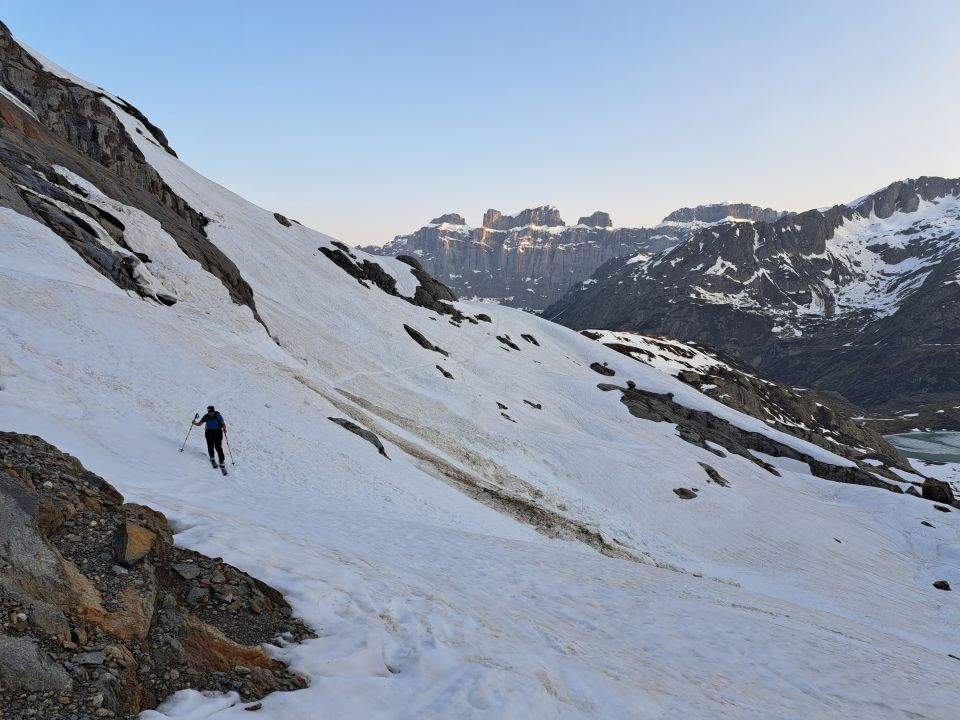 Abfahrt um 10.30 Uhr auf seidenweichem Traumschnee. Die Unterlage blieb genügend hart bis ganz nach unten. Erst auf der Hauptroute zum Sustenhorn waren die alten Spuren etwas holprig. Die Steilstufe auf 2400 m lässt sich in der Mitte gut abfahren; unterhalb liegen einige Eisbrocken auf der Spur und der nächste Abbruch kommt bestimmt.