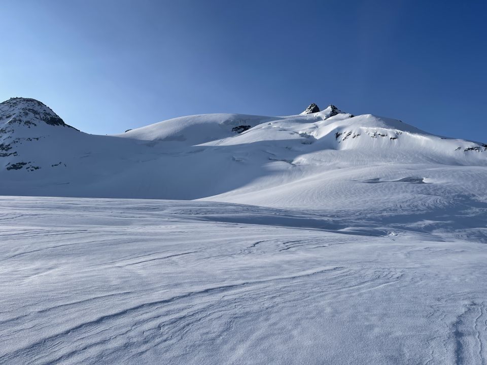 Einstieg bei der Bächilicke um 9.45 Uhr: der Schnee war auf dem steilen Hang bereits weich. Sehr schöner Sulz entlang dem ganzen Bächigletscher bis ca. 2500 m. Dann zunehmend weicher aber fahrbarer Schnee. Ab 2300 m wird es prekärer, aber man kommt über Schneefelder mit den Skis bis zu wenige hundert Meter vor dem grossen Lawinen-Wall. Ab da sehr angenehme Wanderung in ca. 1 h 30 bis Reckingen.