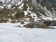 Unten gibt's einige kurze Stelle, wo man die Skier tragen muss. Bei P. 2528 gibt's Lawinenschutt und man muss die Skier ca. 50hM tragen. Hier haben wir die Steigeisen angezogen.