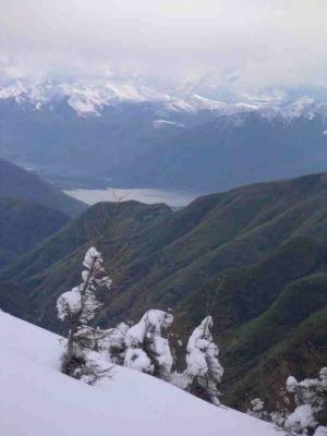 Schneereste noch bis ins Dorf. Fahrbar noch bis zu den Monti, einige Kratzer in Kauf nehmend. Ab 1500 M sofort viel Schnee, rel. gut gesetzt und nach klarer Nacht gefroren. Oben windgepresst, aber gut fahrbar. Sehr schöne Aussicht auf die grünen Buchenwälder. noch sind nicht allen steilen Hänge entladen, z.t. aber mächtige Bretter abgegangen und weit vorgestossen (z.B. am Pilone).
