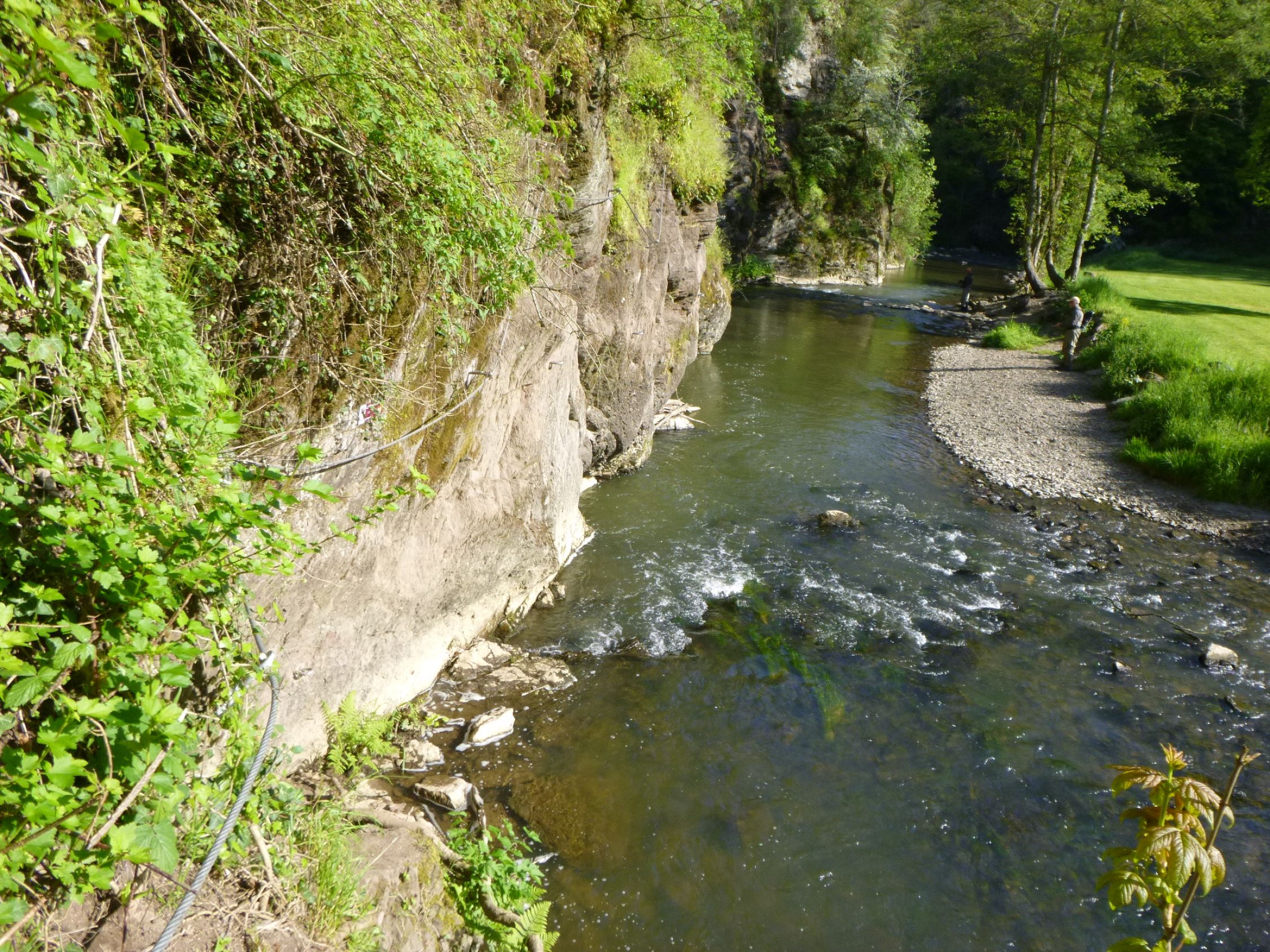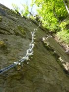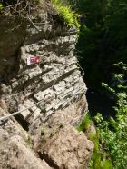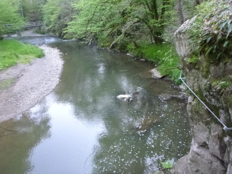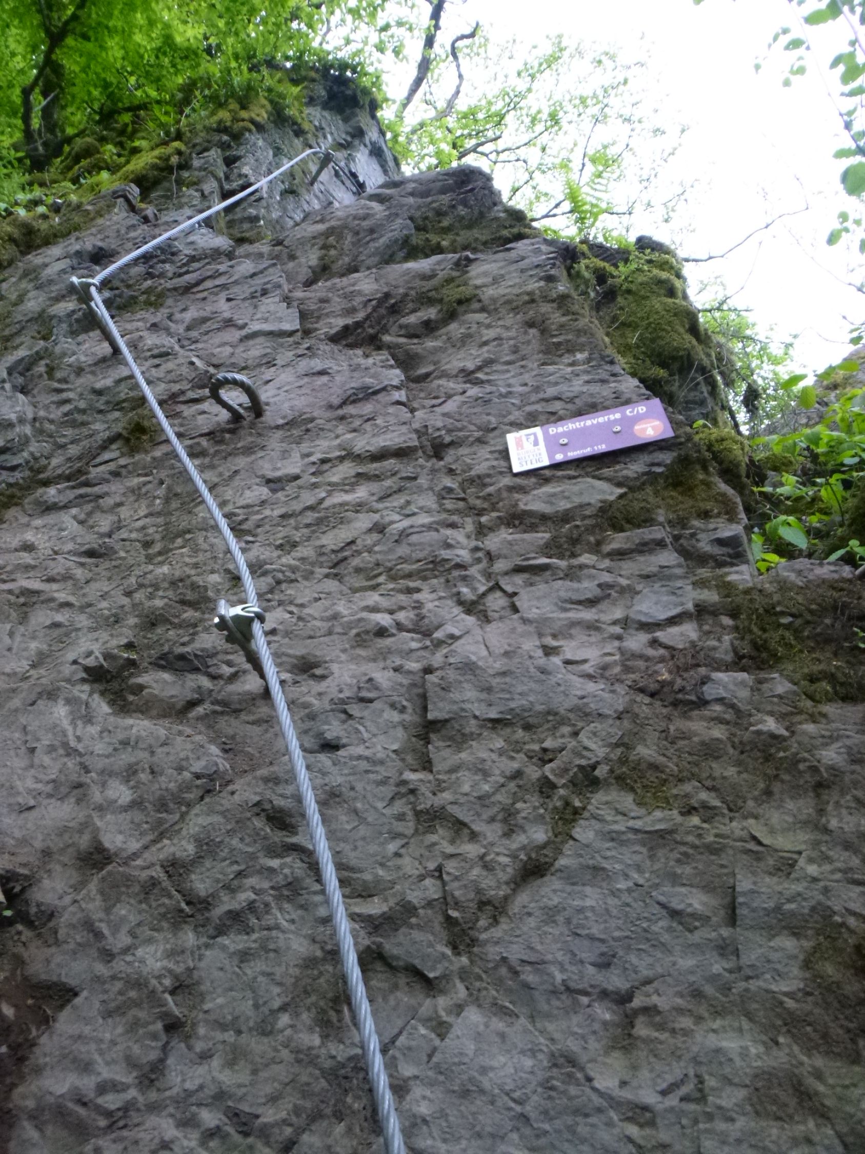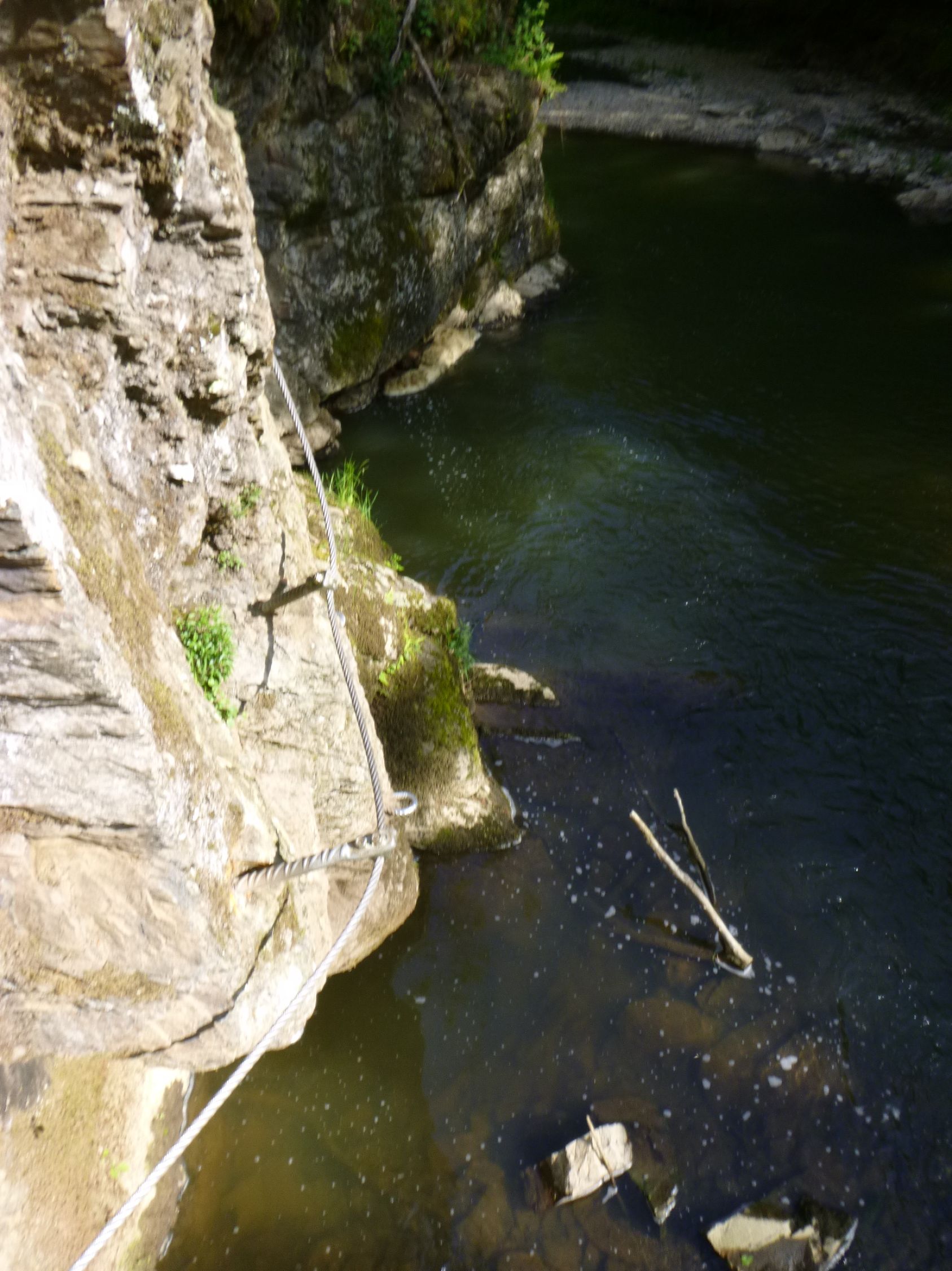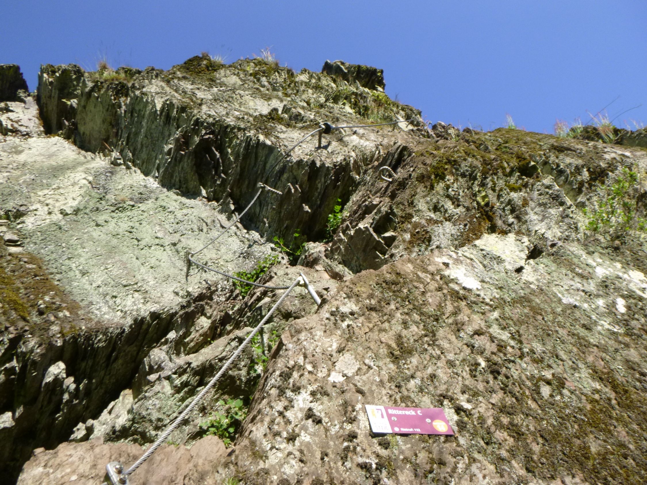 Dieser Klettersteig dürfte wohl zu den abwechslungsreichsten, längsten und schönsten Routen gehören nördlich der Nordalpen. Die Steig-Planer haben eine interessante Routenführung in dem Tal mit der S-Schleife der Lieser entwickelt. Den Steig-Errichtern ist m.E. eine gute Sache gelungen. Es wurden die künstlichen Trittmöglichkeiten im Fels genutzt, und nur dort Eisenbleche, oder -bügel eingebohrt, wo notwendig, um die Kletterschwierigkeit nicht zu hoch werden zu lassen, oder nur an den Fixpunkten. Wenn dessen Frequentierung weiterhin so hoch bleibt, werden die natürlichen Trittstellen bald „abgespeckt“ sein, denn das vulkanische Basaltgestein ist nicht so hart wie Granit.
